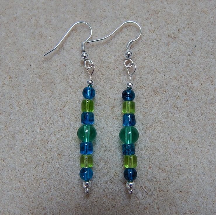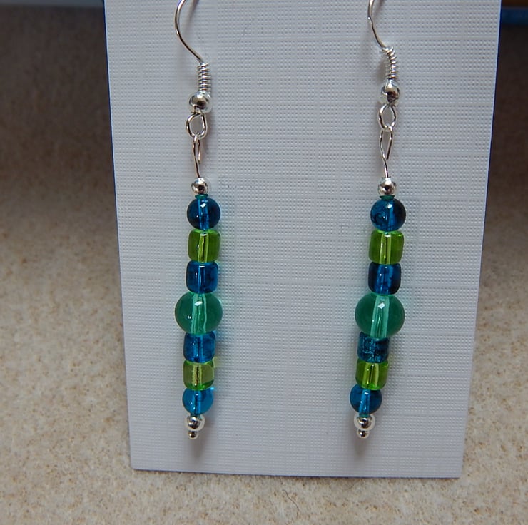 Made with silver plated ear wires and parts. Also glass beads.