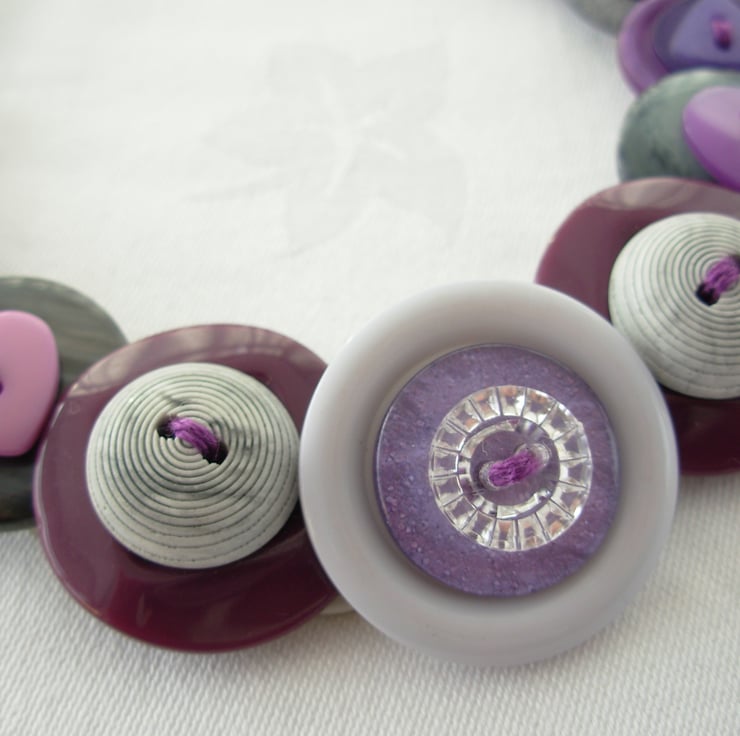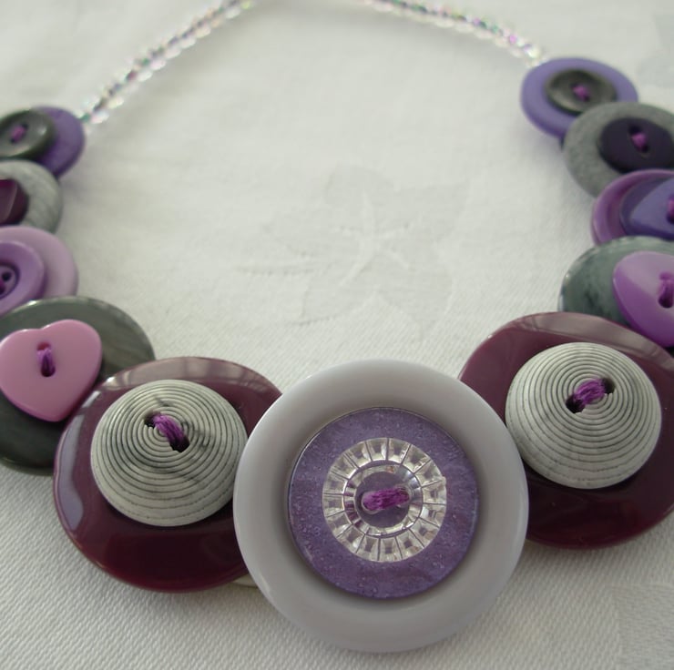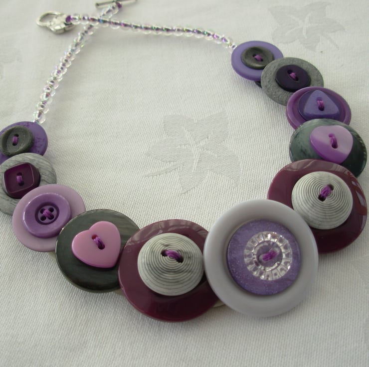 This pretty button necklace has been made in a choker style. Layering and stacking assorted grey and mauve buttons. It's threaded and knotted and finished with little clear Aurora Borealis beads and a silver plated toggle clasp.
