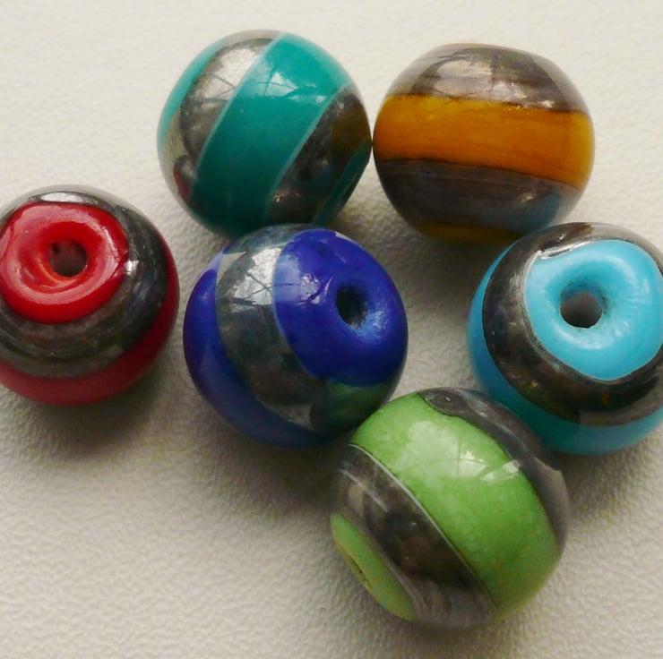 This listing is for six glass lampwork round banded beads in six different colours.