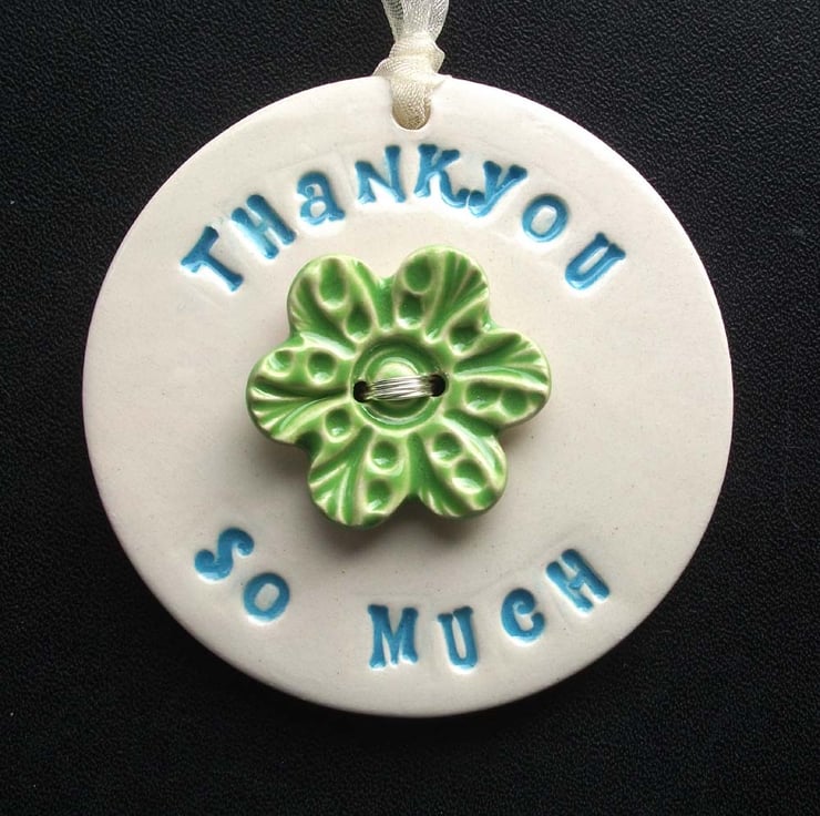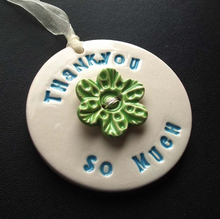 This cute little hanging decoration has been made from white earthenware clay and embossed with the words "Thankyou so much"