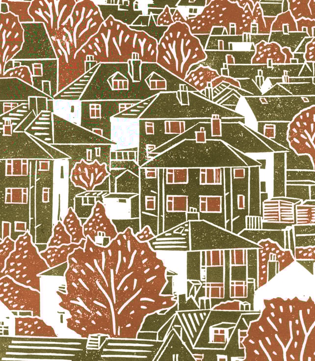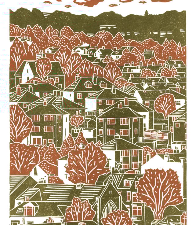 I live in Sheffield, and I am surrounded by great views (from the seven hills). Over the years I have become more and more interested in the compositions that the views make up, and feel compelled to turn these into linocuts. I love the mix of new and old architecture, suburban and urban buildings, mixed with the rural parts. It is a very inspiring city!