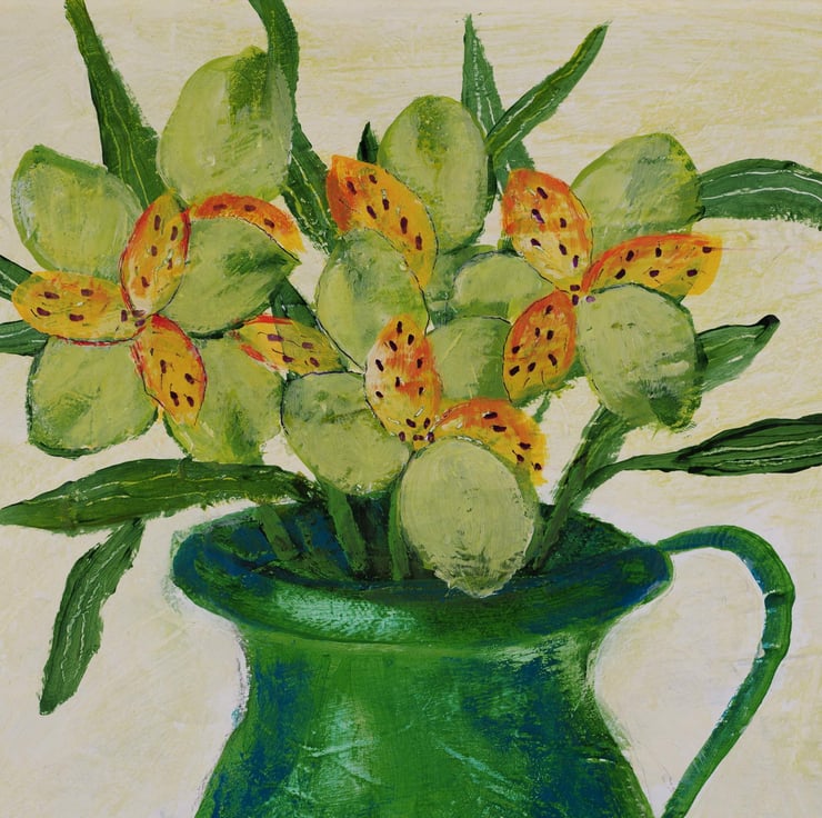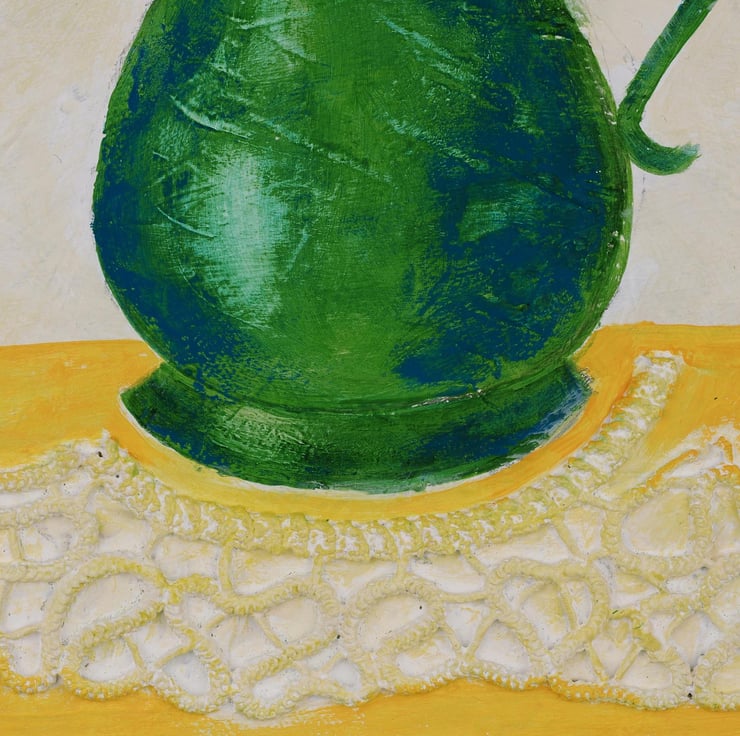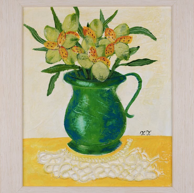 This is an original still life mixed media painting with flowers in a green vase, created in acrylic on canvas board. The artwork is framed in an off white wooden frame and ready to hang. I also incorporated a piece of doily made by my mother which gives the artwork a unique and vintage touch. Size with frame: 12.50" x 14.5". Title: Happy Spring I.