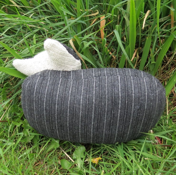 The background fabric is a woollen pinstripe, and the cream accents are a textured cotton knit fabric.
