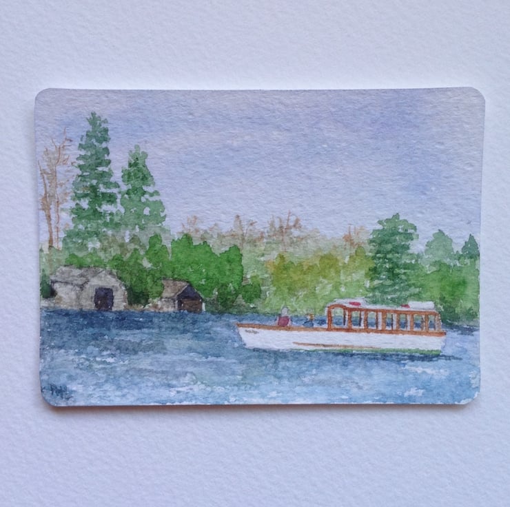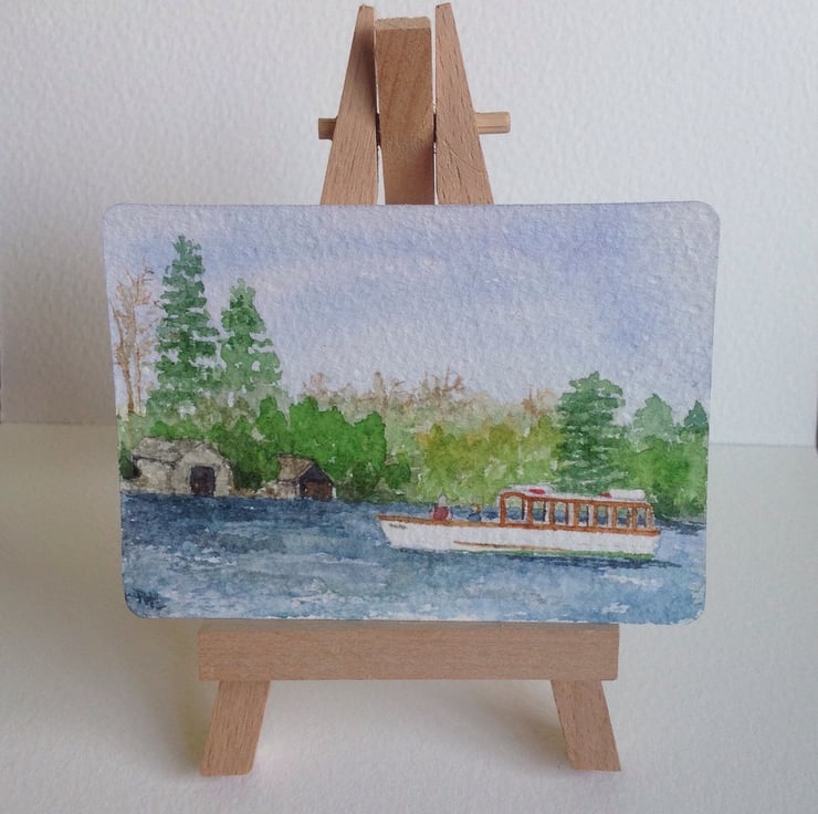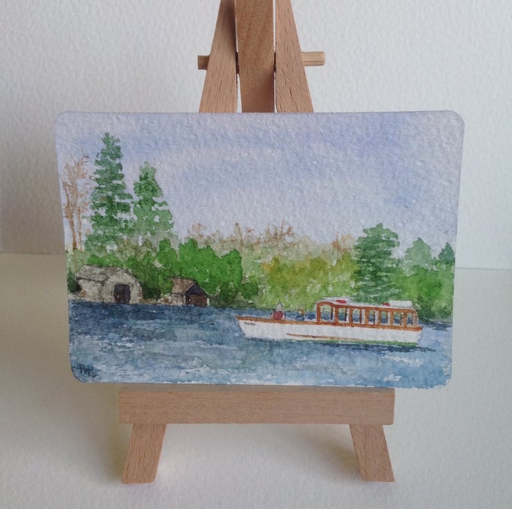 This ACEO is an original, hand painted watercolour of a boat motoring past Belle Isle, Windermere, in the Lake District. The painting measures 2.5 x 3.5 inches (63 x 89mm), the standard size of collectible ACEOs.