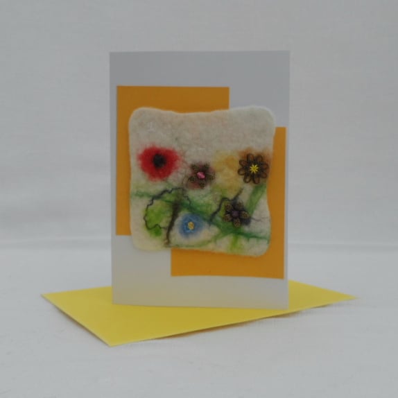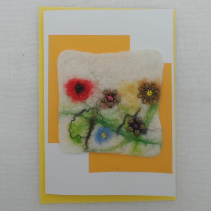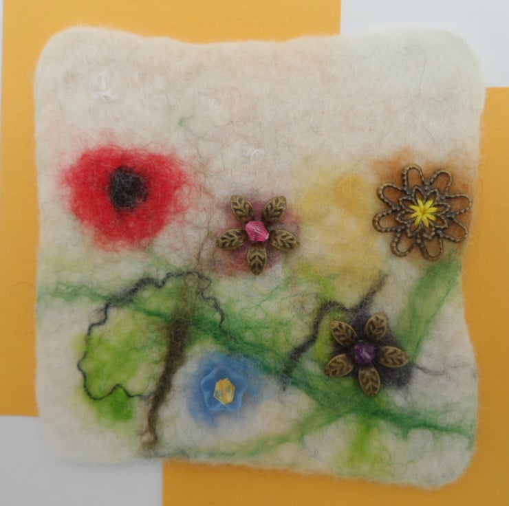 A gorgeous card made using a piece of felt made from merino wool and silk fibres which have been laid out and wet felted onto a white merino wool background to give a floral design. This floral pattern has then been embellished using antique bronze effect findings and bead detail. The felt piece has then been mounted on an A6 size white greetings card. The card has been left blank inside for your own message and is provided complete with a complimentary yellow envelope in a cellophane presentation bag.