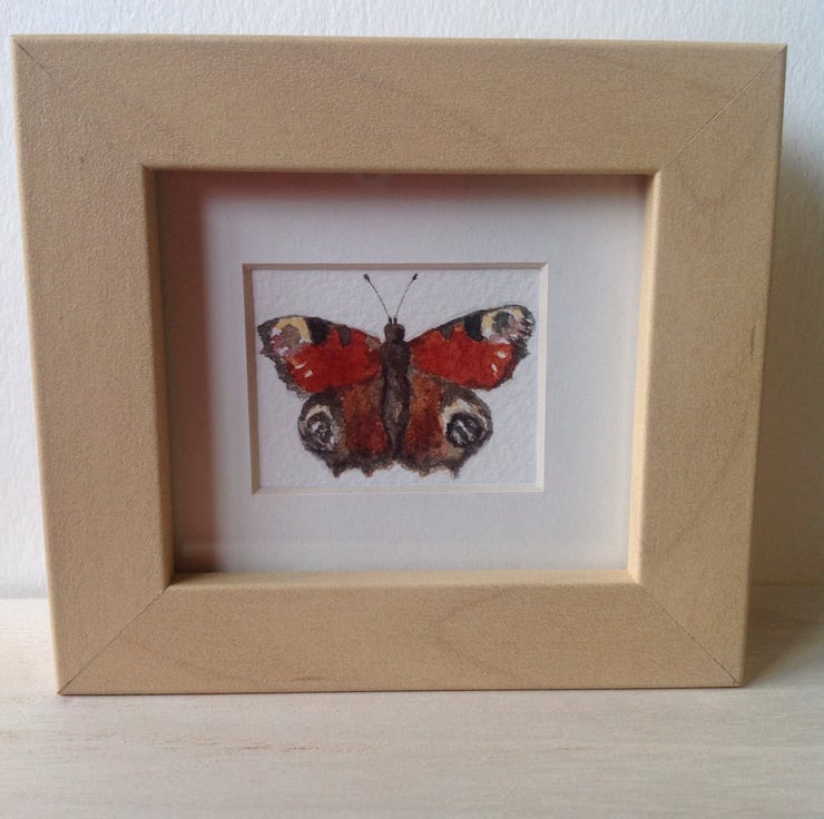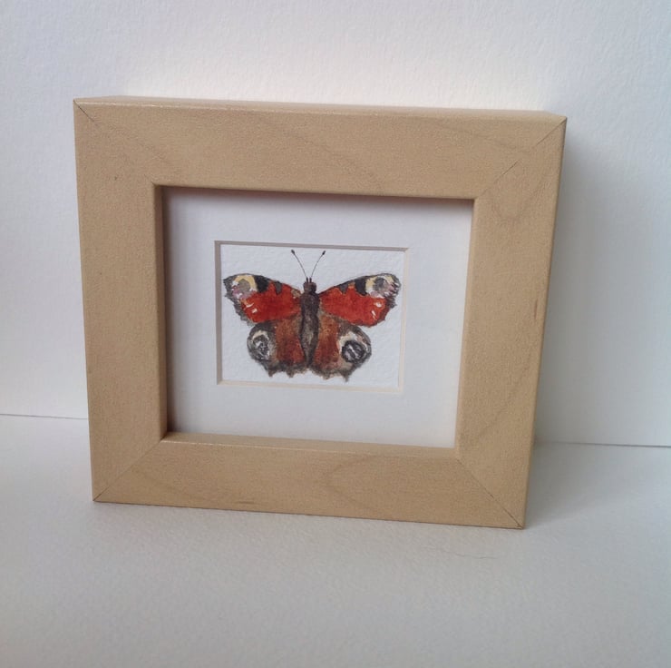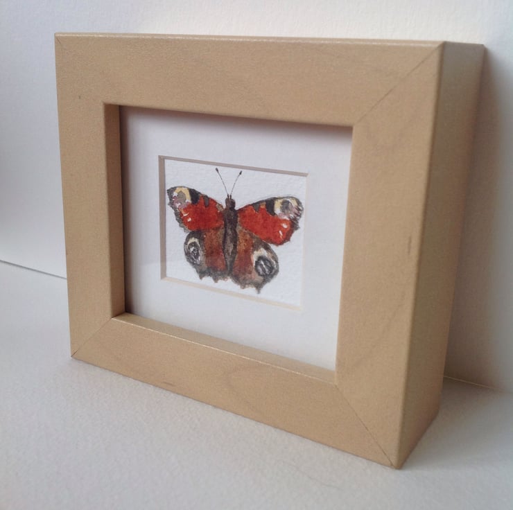 A framed miniature watercolour of a Peacock butterfly. The overall dimensions of the frame are 10 cm x 11 cm and 3.5 cm deep. The frame is self-standing, as in the photos, but could be wall mounted if you wanted.