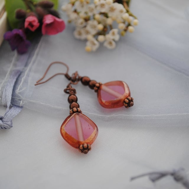 Antique copper earrings with diamond shaped deep pink beads with a copper lustre finish. The earrings are finished with lustre brown / copper beads and antique copper daisy spacers.