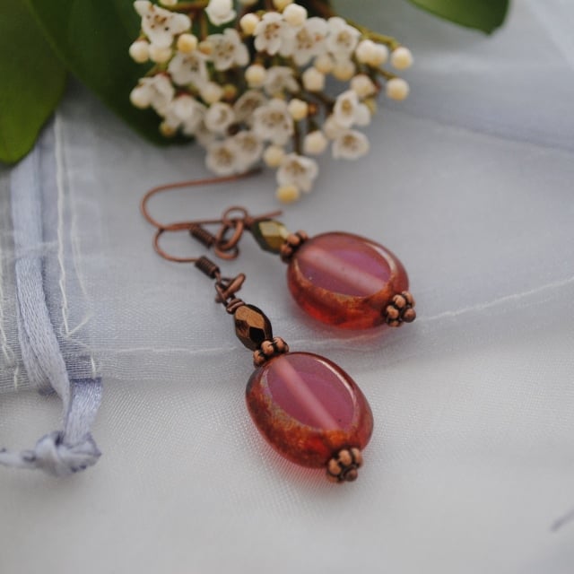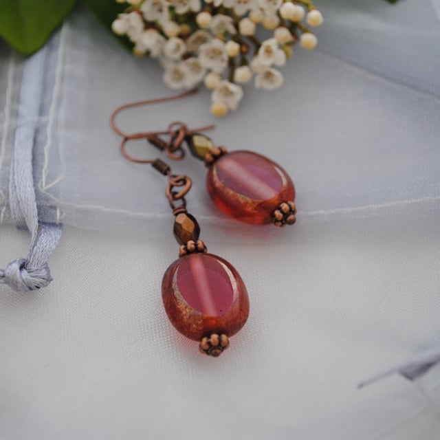 Antique copper earrings with oval shaped deep pink beads with a copper lustre finish. The earrings are finished with a lustre brown / copper faceted bead and antique copper daisy spacers.