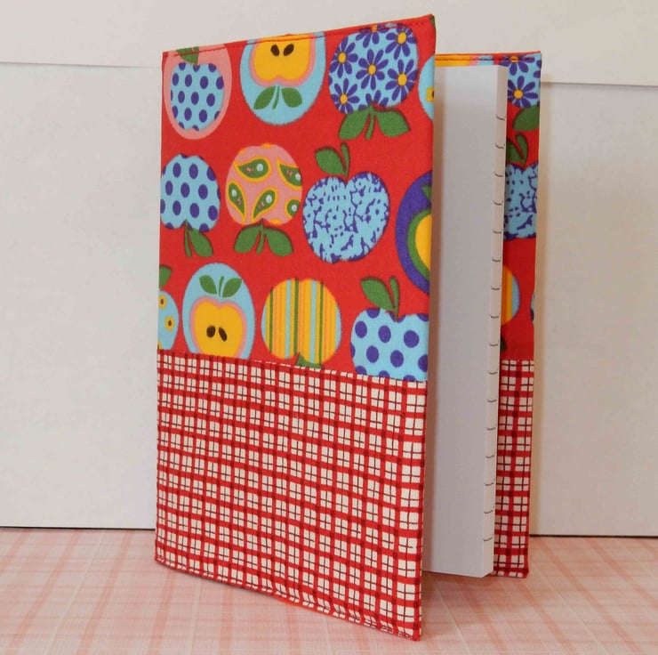 This is an A6 notebook, with lined paper, it has been covered with two fabrics, one featuring colourful apples, and the other a toning check. It is interfaced and lined in plain fabric, the cover can be removed, and a replacement notebook fitted when needed.
