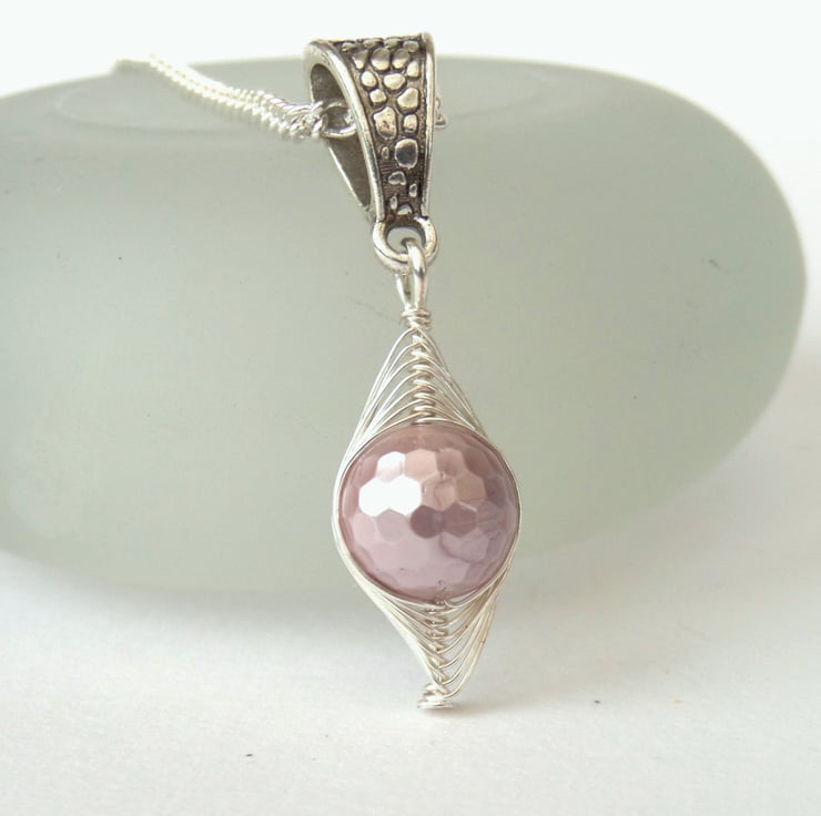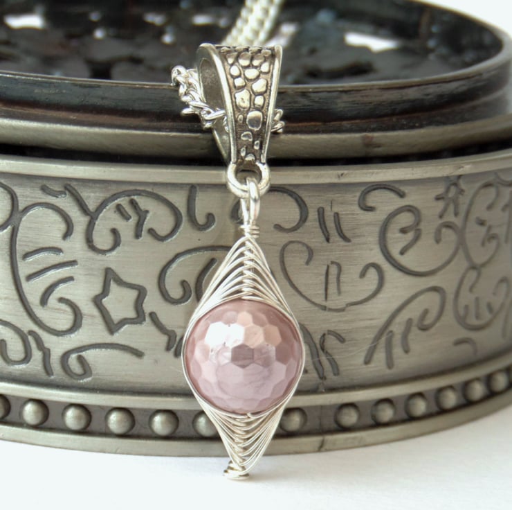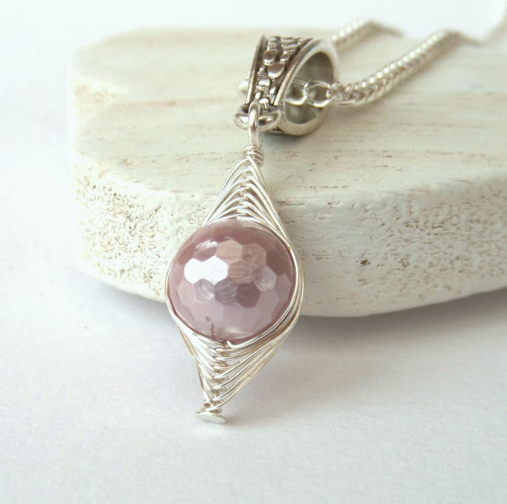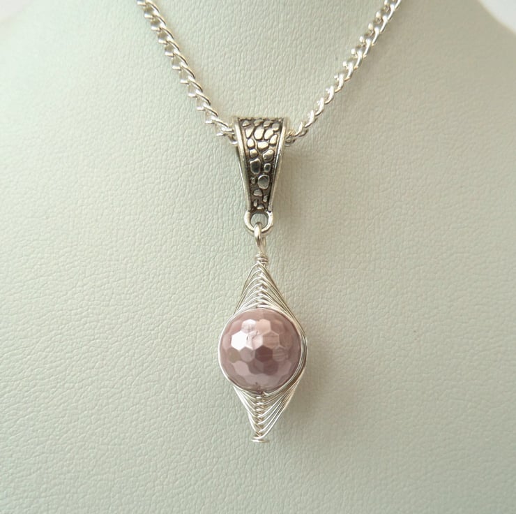 A stunning dusky pink faceted shell pearl wire wrapped in a lovely herringbone pattern is the focal point of this unique necklace.