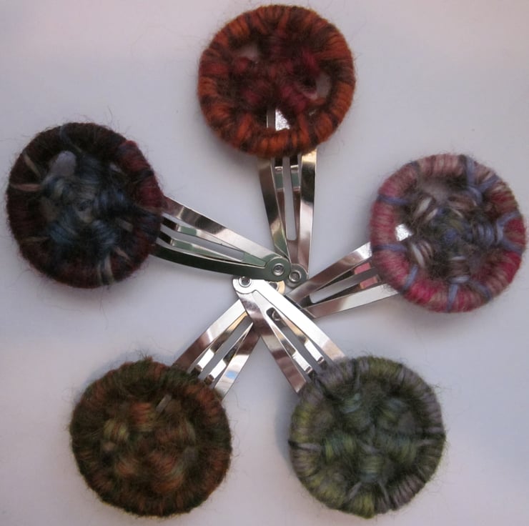 Silver coloured metal hair clip with homemade dorset button in pure wool over brass ring.