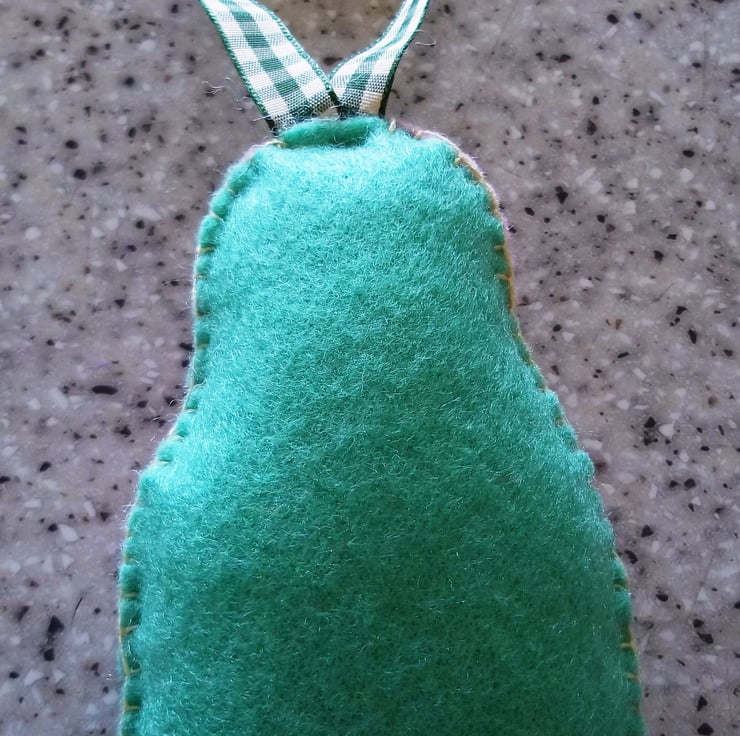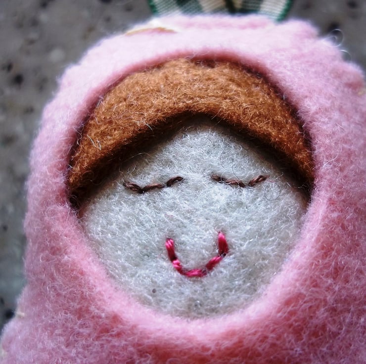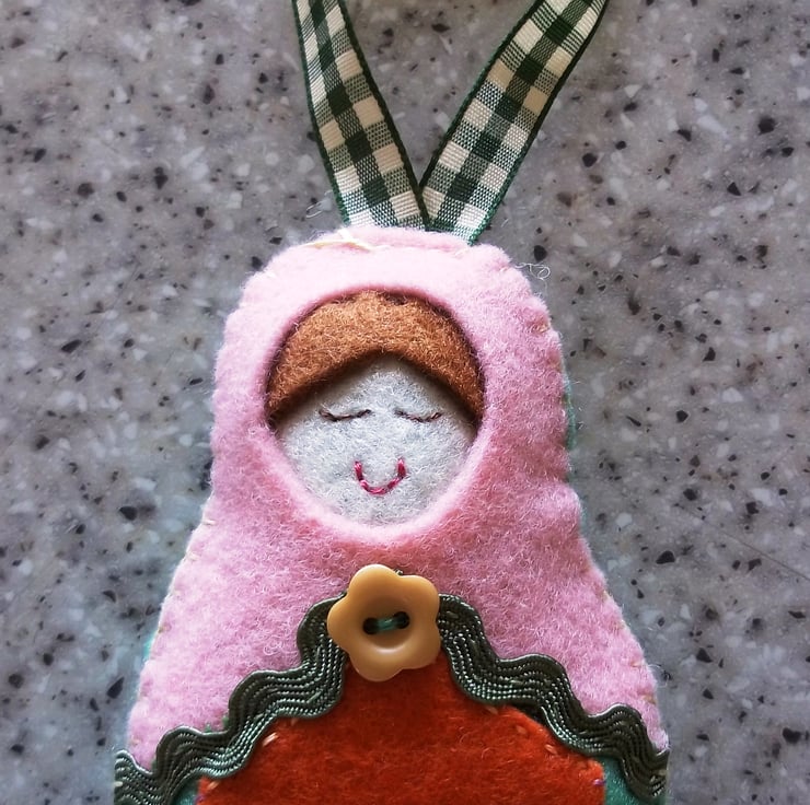 Made predominately of coloured felt this decoration is all hand stitched and embellished which hand embroidered flowers on the belly piece and gentle sleepy face. The item also has additions of complimenting ric rac and flower button. The hanging loop is made out of gingham ribbon. She is lightly stuffed to give shape.