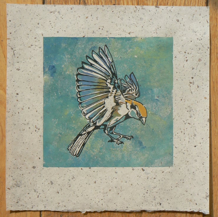 This linocut is printed in two layers, the first being a blend of lots of colours which varies every time so that each print is original. The second layer is black and adds the detail.
