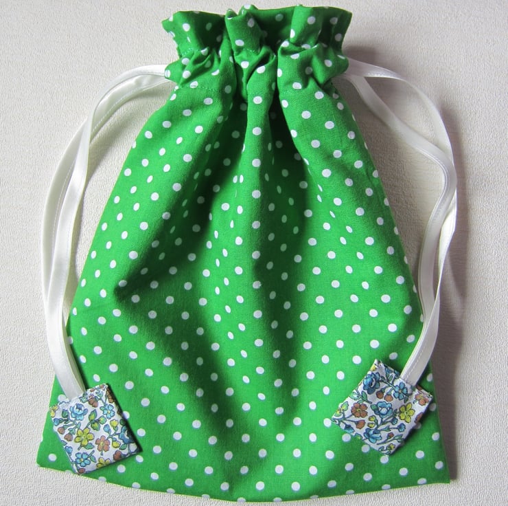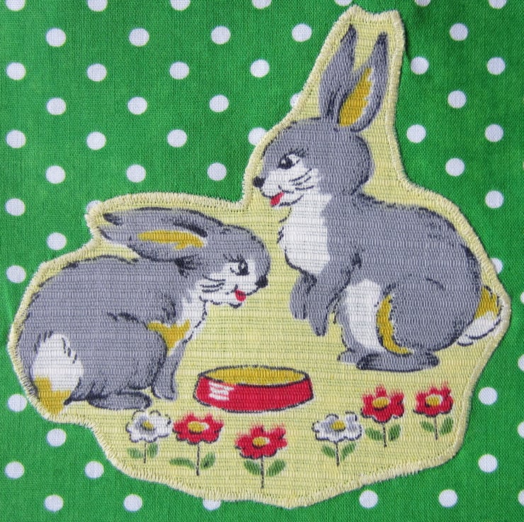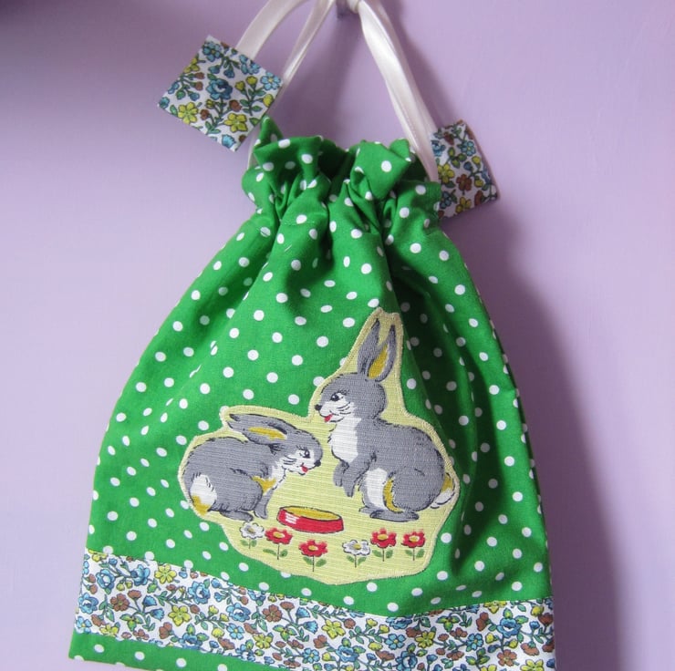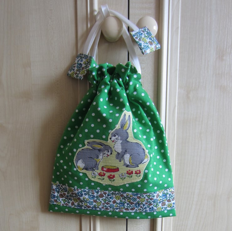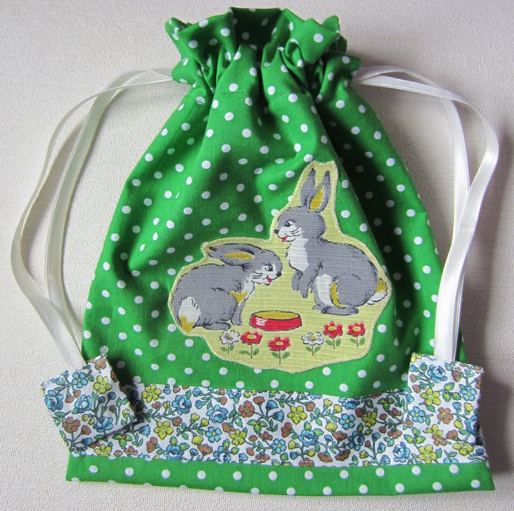 Green and white spotty drawstring toiletries, shower, wash bag with appliqued bunny rabbits (made from unused 1950s vintage fabric) and decorative floral strip and tabs. Lined with showerproof fabric. Useful for toiletries, make-up and babies bits and bobs.