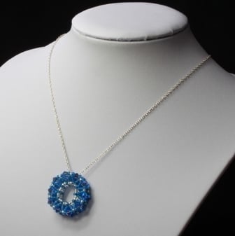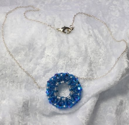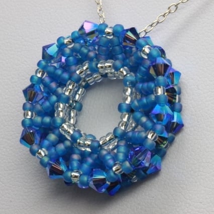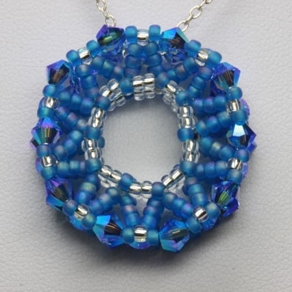 This pretty little pendant is ideal for anyone who likes sparkly jewellery but who does not like large or flamboyant pieces. It is in the shape of a double-sided wheel; handwoven using tiny seed beads in silver and frosted blue and high quality, glittery, 4mm sapphire blue Swarovski xilion crystals. The seed beads are Japanese Miyuki, well known for their quality and therefore popular for bead weaving. The crystals have an 2xAB (aurora borealis) coating, a thin metallic coating on both sides of each crystal to give them a lovely iridescent shimmer. The pendant is strung on a silver-plated chain with a trigger clasp.