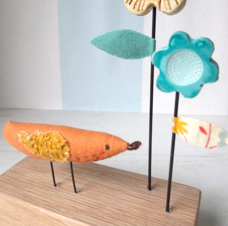 This hand stitched little cotton fabric bird has a wing made from tiny trimmings and two little wire legs. It is perched on a sanded and painted wooden block.