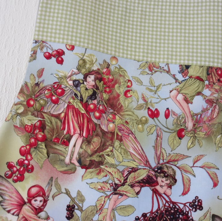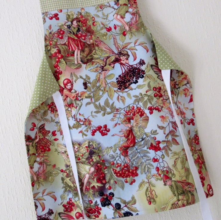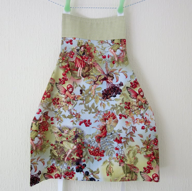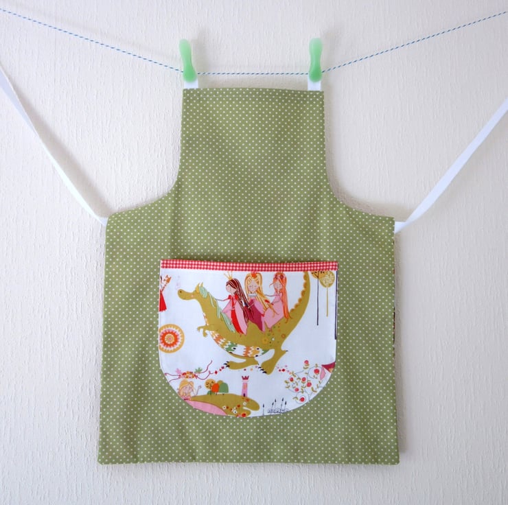 This little apron has a beautiful fairy fabric in reds and greens on one side, and reverses to a beautiful fairy and dragon pocket set onto a green dotty print on the other side. What side will your child wear today.