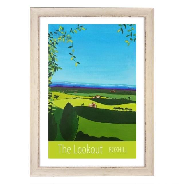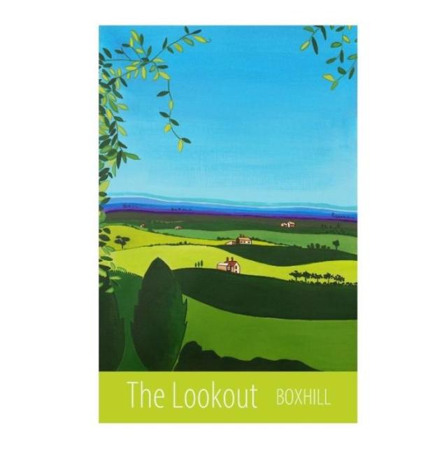 A contemporary travel poster style print of the view from the Lookout on top of Boxhill, near Dorking in Surrey, from my own original acrylic painting.