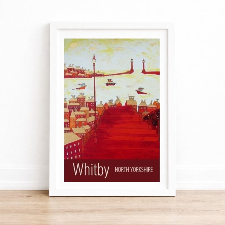 A contemporary travel poster style print looking down the famous 199 steps from the abbey ruins to the working harbour and town below,, from my own original acrylic painting. A perfect gift for those who love Whitby!