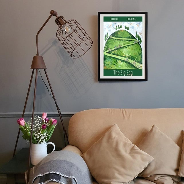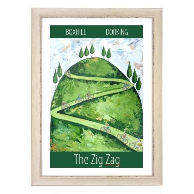 A contemporary travel poster style print of cyclists climbing the famous Zig Zag, Boxhill near Dorking, Surrey, from my own original acrylic painting.