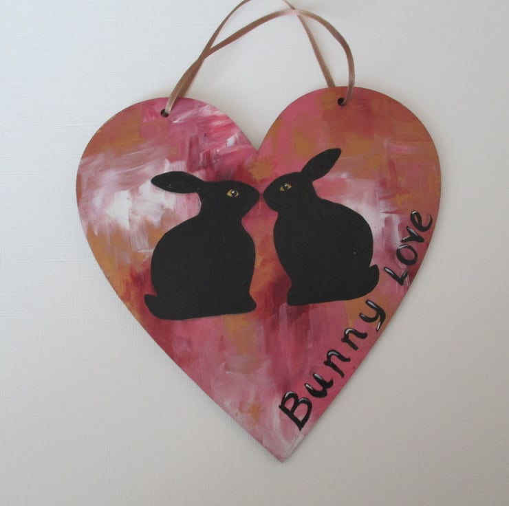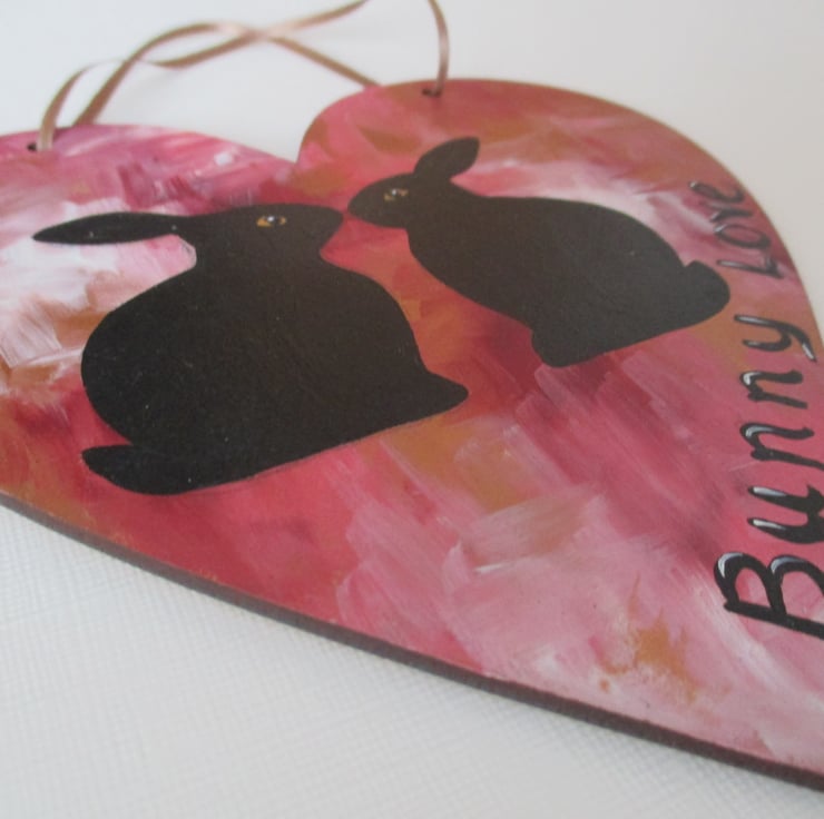 This is a large wooden hand painted decorative heart, with two black bunny rabbits and the text 'bunny love'.