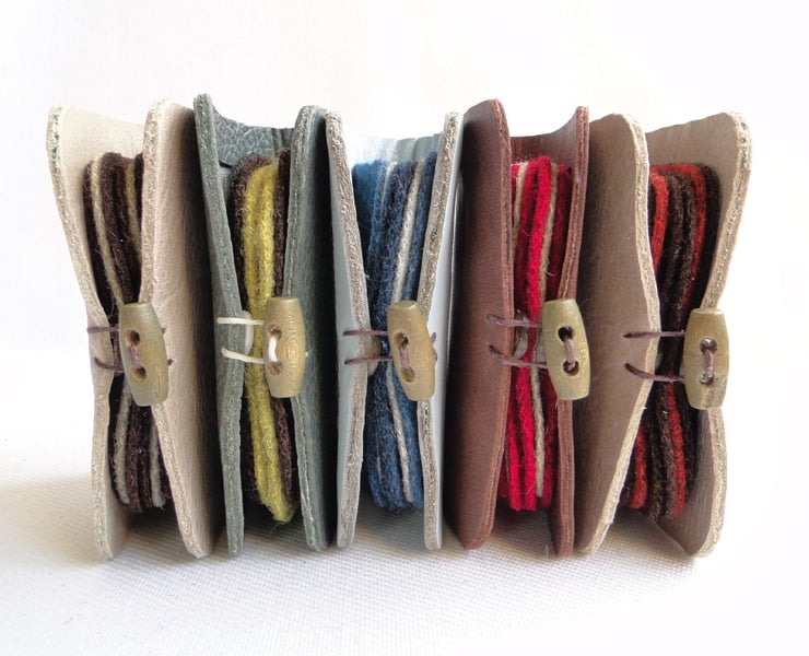 Keep them together in this soft cream leather case, measuring 9cm x 7xm with a hare fabric interior and six separate 'pages' for needle storage in brown and cream felt. Fastened with a toggle button.