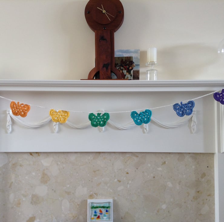 The butterflies are suspended from a cream crochet chain and is a lovely decorative item for use indoors or out. (I wouldn't recommend prolonged use outdoors in all weathers)