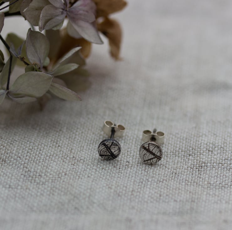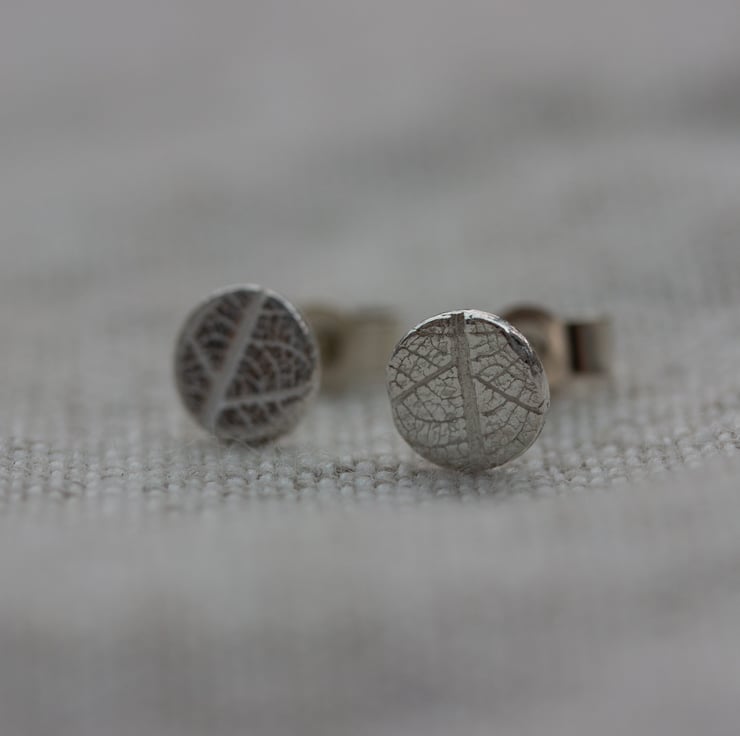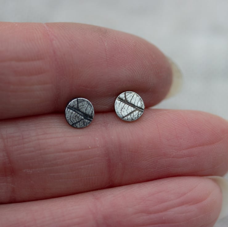 Sweet little leaf pattern stud earrings handmade from recycled silver.