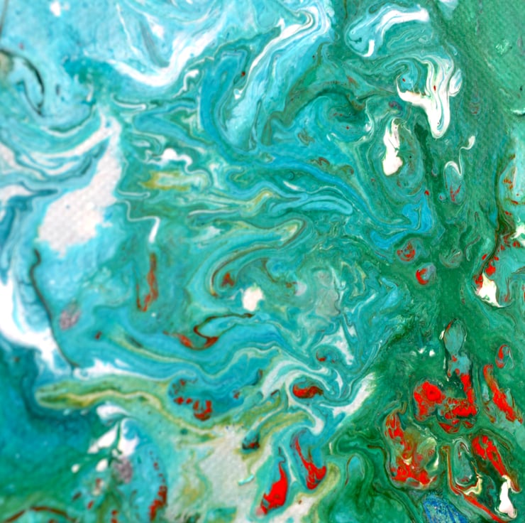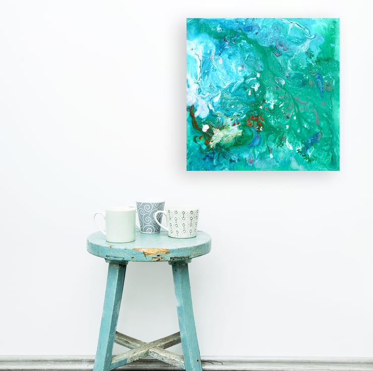 This is one of my original, fluid abstract paintings. The title of the painting is 'All at Sea', and the colours are Green, teal, turquoise, white, silver, and a hint of red and orange.
