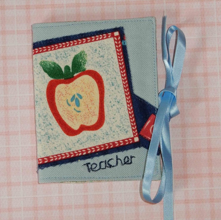 This needle case measures approx. 4.5 x 3 inches and is made from a blue woven fabric with a panel showing an apple and the word teacher has been added by machine. It is lined in a pretty print fabric and has four flannel leaves for your pins and needles. It is fastened with ribbon ties, which can be tied right round the case for protection in a bag.