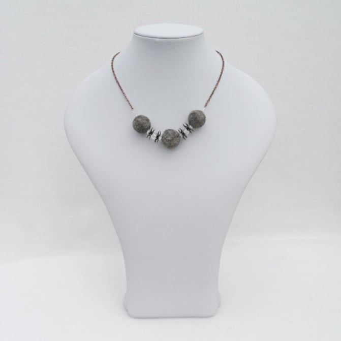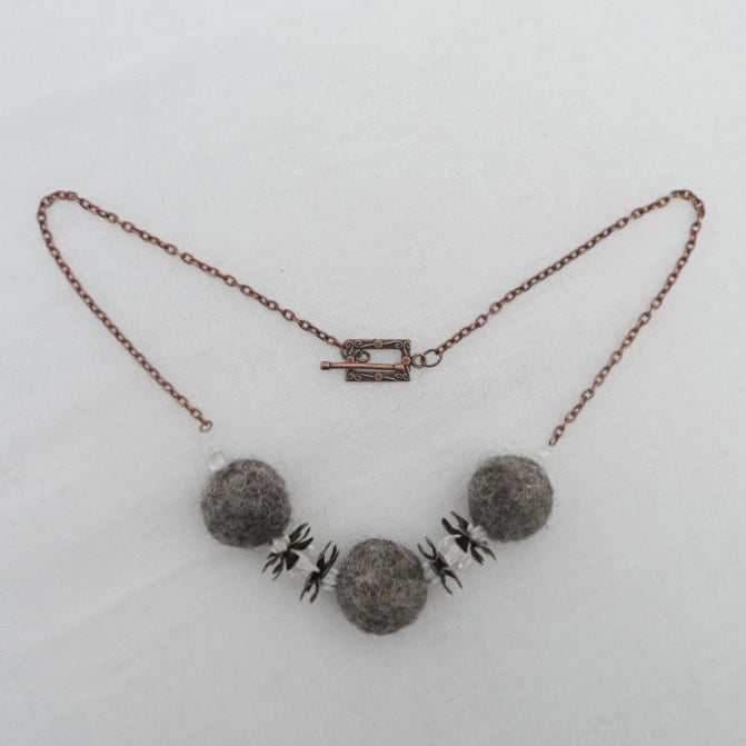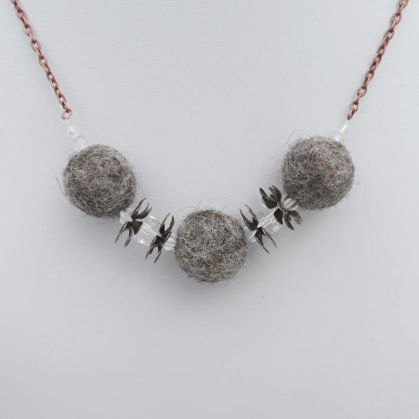 This funky, modern necklace has been made using felted beads which have been felted using natural grey jacob wool. These have been threaded onto a nylon thread and interspersed with a selection of clear acrylic beads and antique bronze effect flowers. The central beaded area is then suspended from antique copper effect chain to create a necklace that is approximately 50cm (20") long. The necklace is fastened using an antique copper effect toggle fastening.