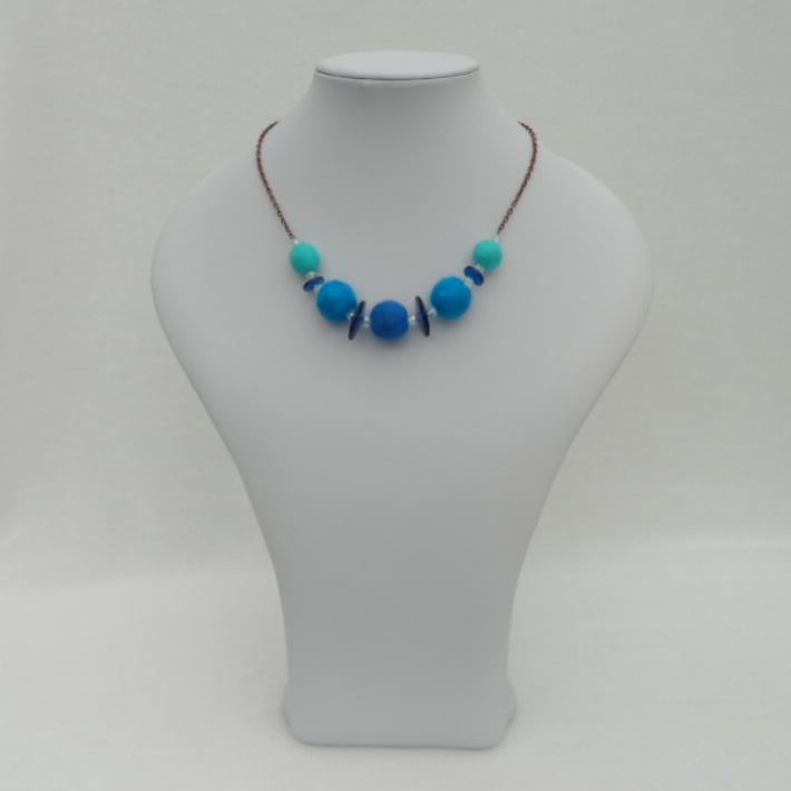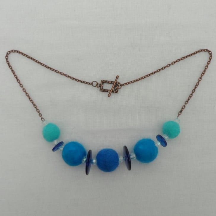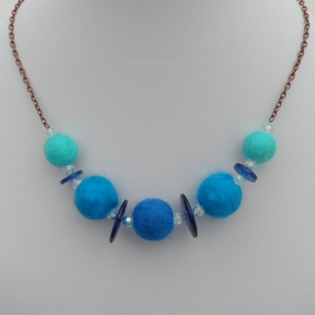 This necklace has been made using felted beads which have been felted using various shades of blue merino wool. These have been threaded onto a nylon thread and interspersed with a selection of pale blue acrylic beads and blue "jelly" buttons in various sizes. The central beaded area is then suspended from antique copper effect chain to create a necklace that is approximately 52cm (20.5") long. The necklace is fastened using an antique copper effect toggle fastening.