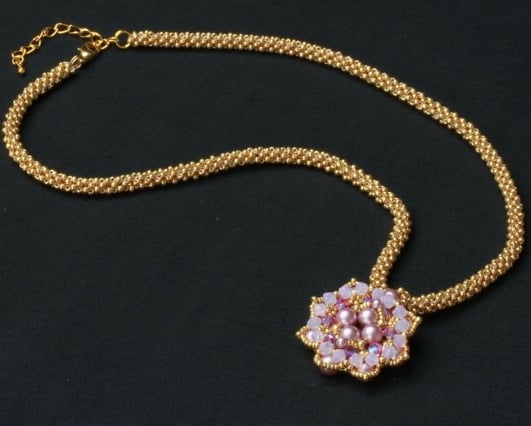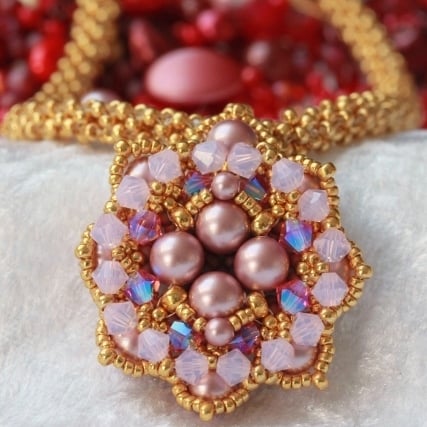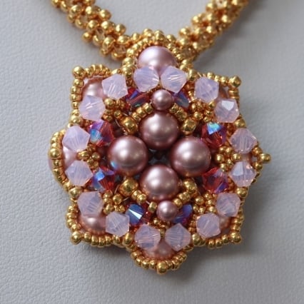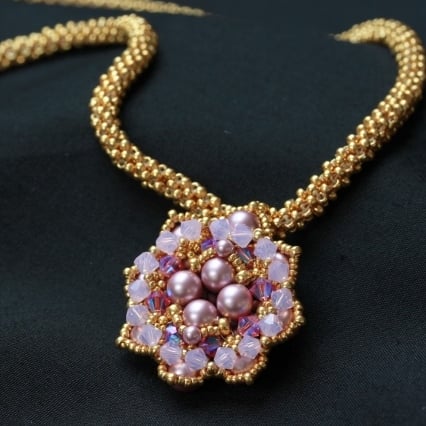 This bead woven pendant is made out of tiny gold seed beads, high quality Swarovski glass pearls and sparkly 4mm Swarovski xilion crystals in shades of rose and milky pink. The seed beads are Japanese Miyuki, well known for their quality and therefore popular for bead weaving. The rose pink crystals have an AB (aurora borealis) coating to give them an iridescent gleam. It is strung from a handwoven rope made from the same tiny seed beads as the pendant, giving the whole piece a substantial and elegant feel. It is finished with a plated gold trigger clasp and extension chain with a pretty drop detail.