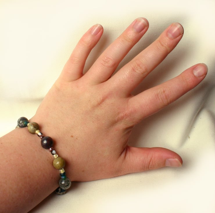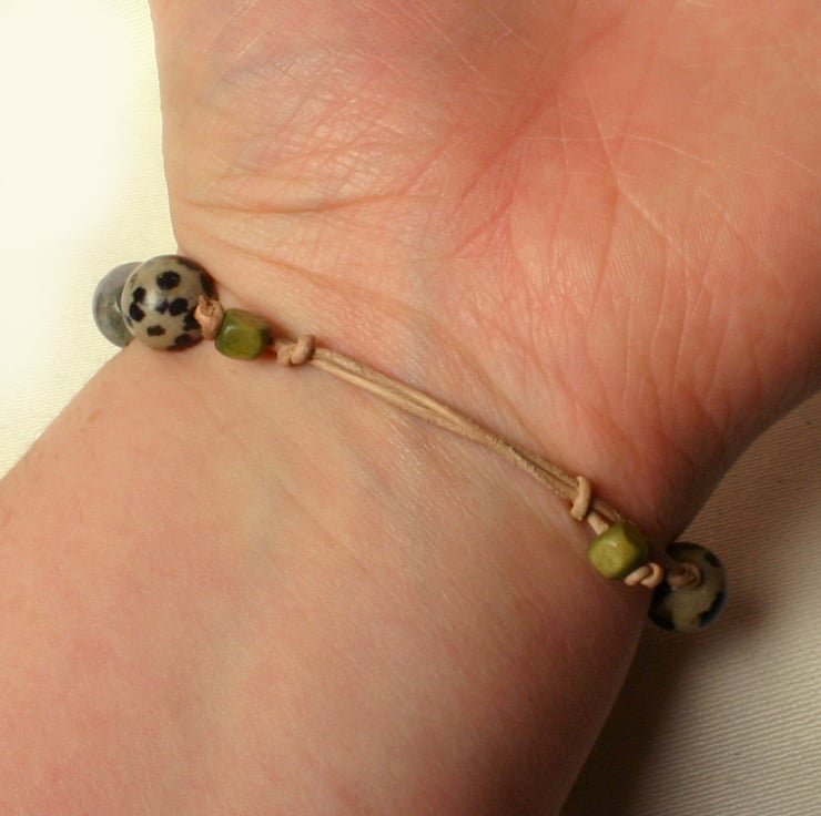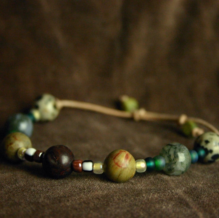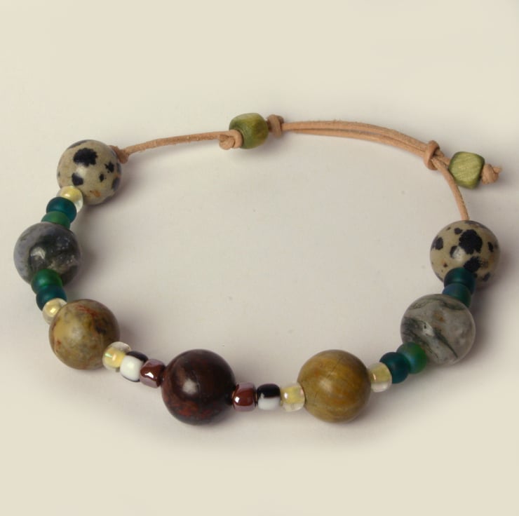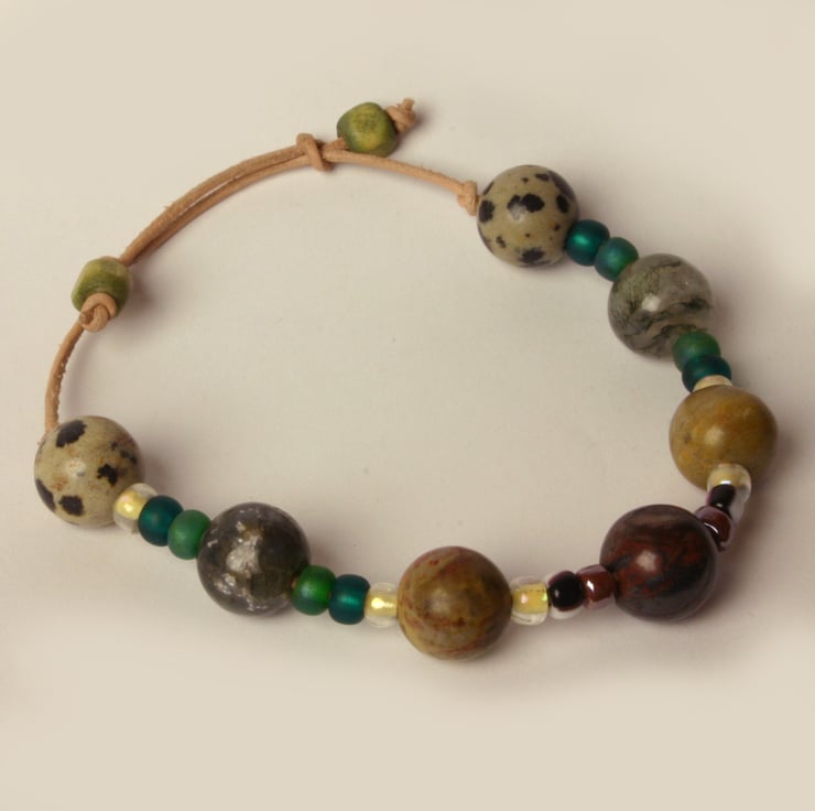 Using a mixture of beautiful stone beads with glass, wood and others, these earthy bracelets are adjustable to fit your wrist size using a slip knot in the leather thong. Each one is unique, with much thought given to color combinations, bead size and even the type of leather thong used to string them. Made by my other half :) The bracelet pictured is the one that you will be sent.