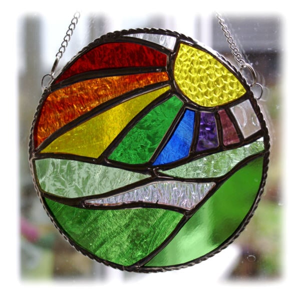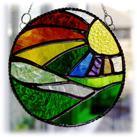 The sun's rays are a rainbow with, at either side a little piece of raindrop, iridescent glass as that's how rainbows happen. Under the rainbow are green fields and a patch of sparkling water as the sun is shining on it.
