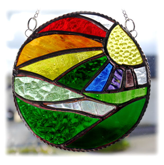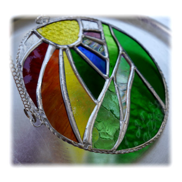 This is a stained glass suncatcher made using the Tiffany copper foil technique.