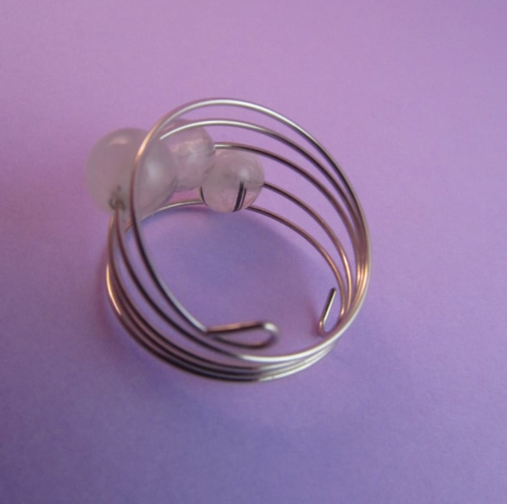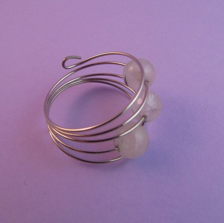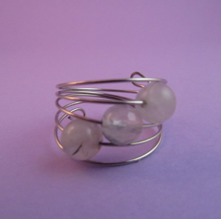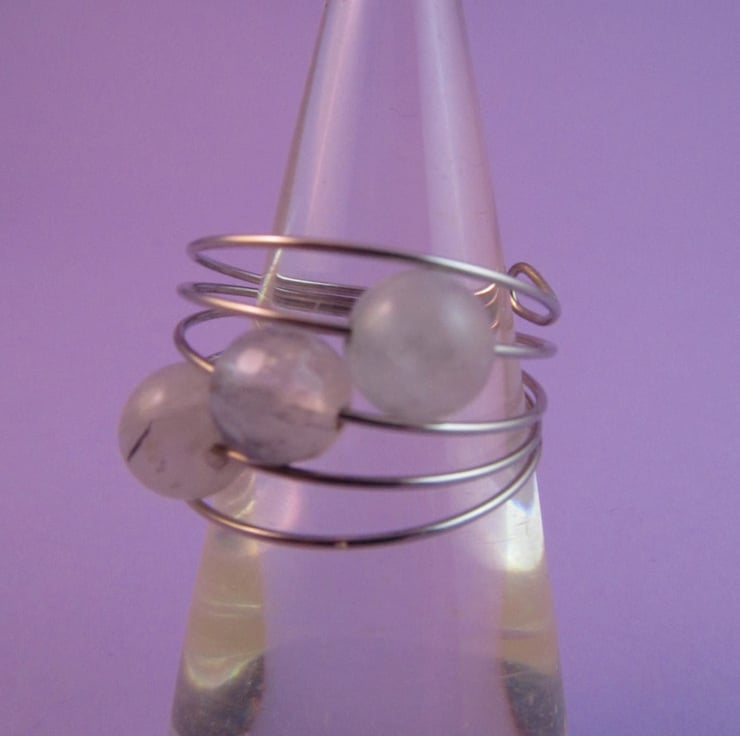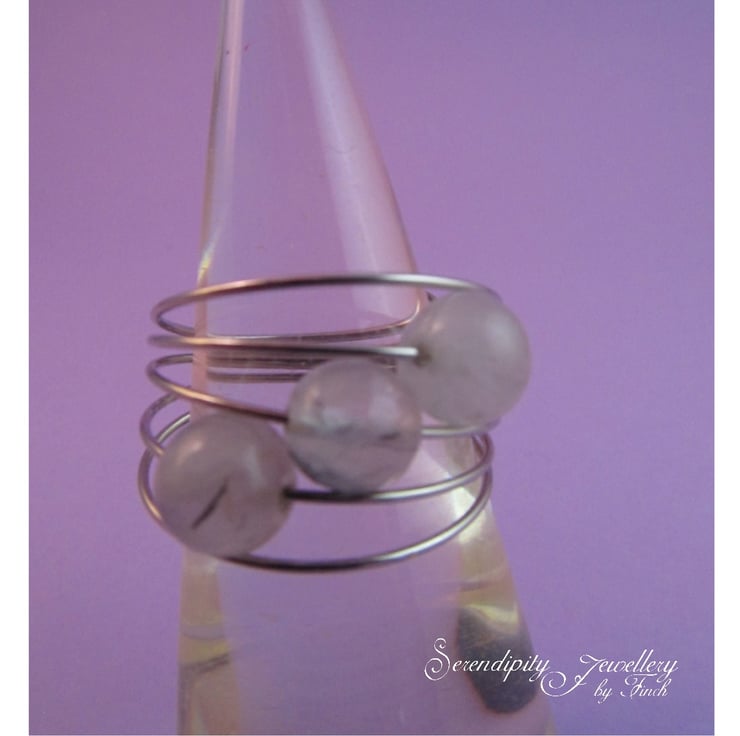 This is a gorgeous rutile quartz silver memory wire ring. It is created with silver colour memory wire, and clear rutile quartz gemstones that have little black inclusions in them. The ring is very comfortable to wear.