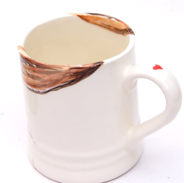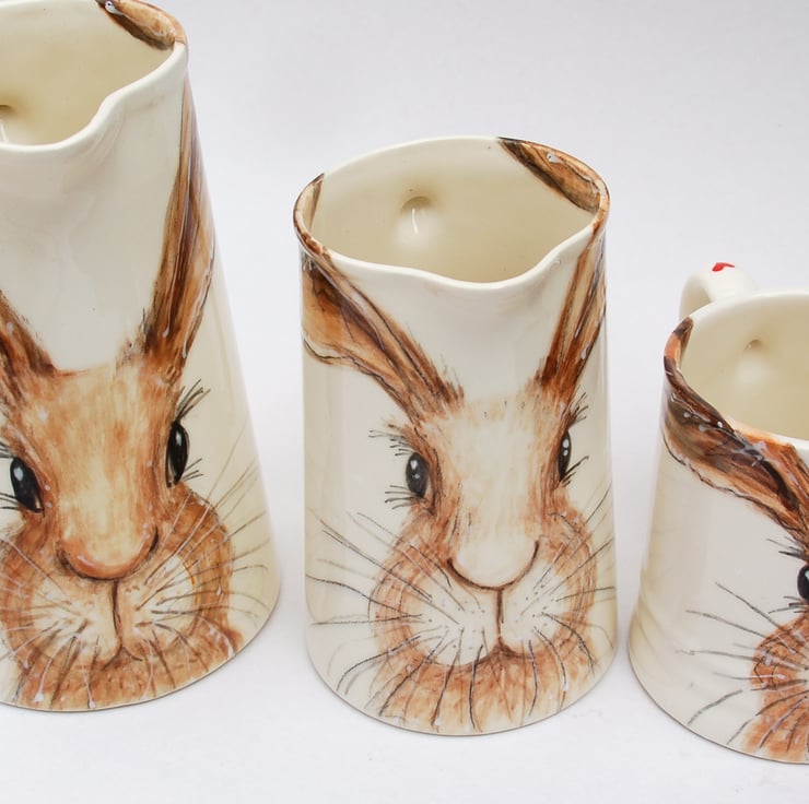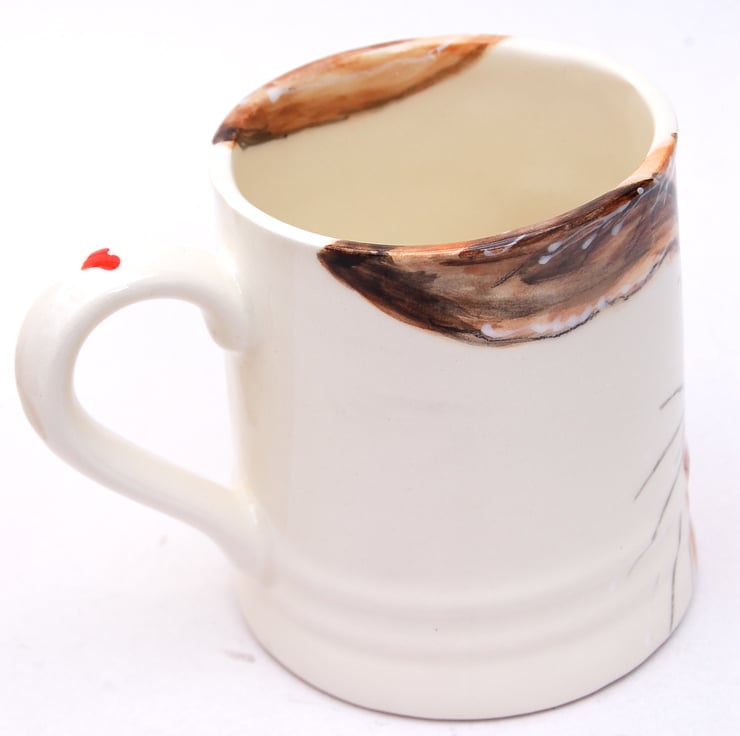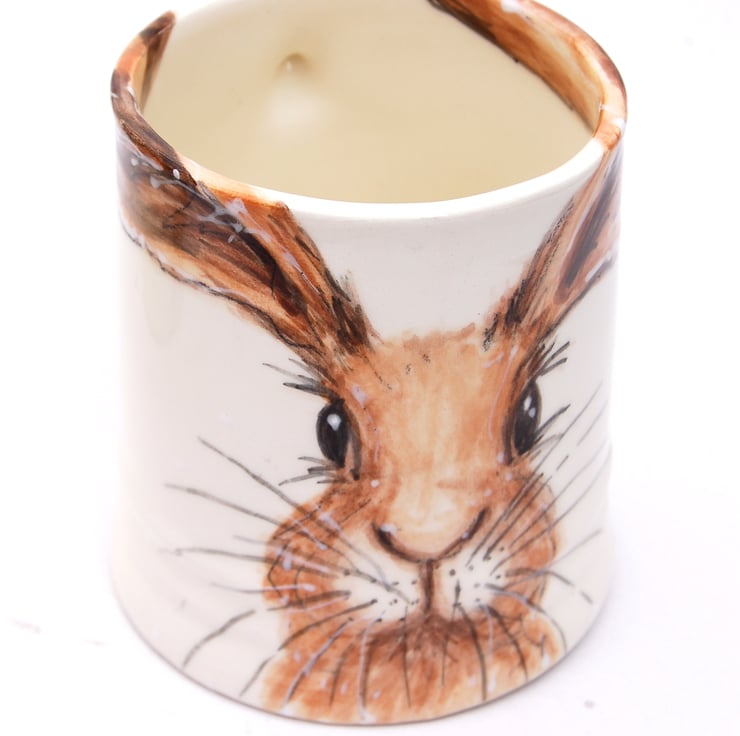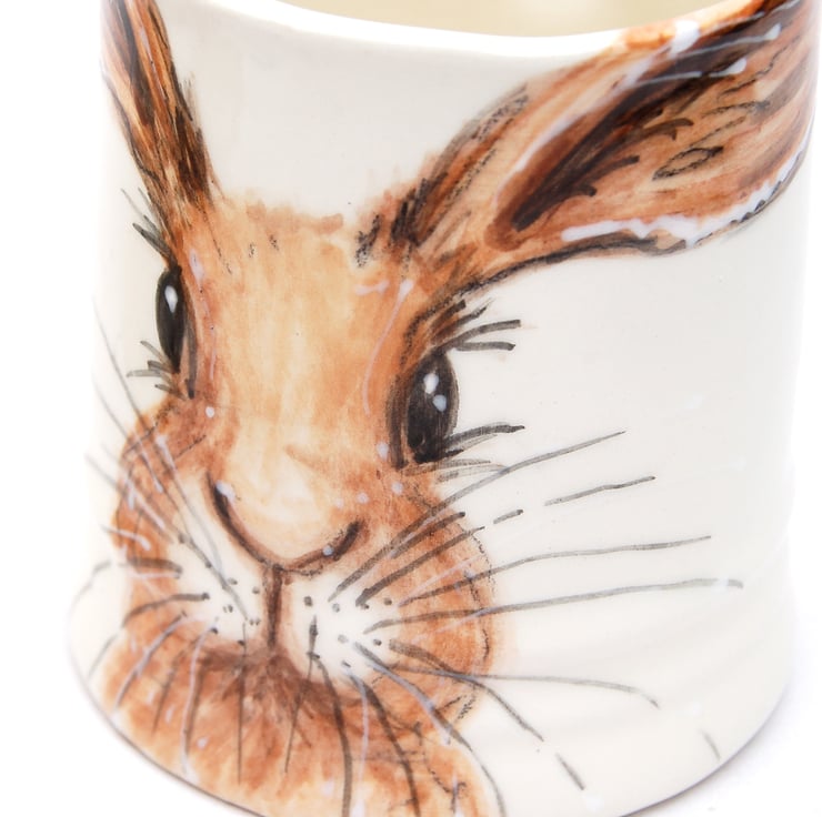 These are our mugs of choice at home. I slip cast and high fired earthenware and hand paint each hare individually with a hare front facing with ears flopping over the top of the mug.