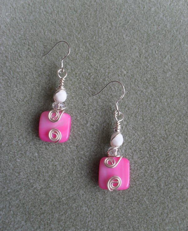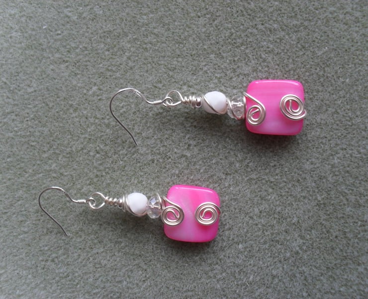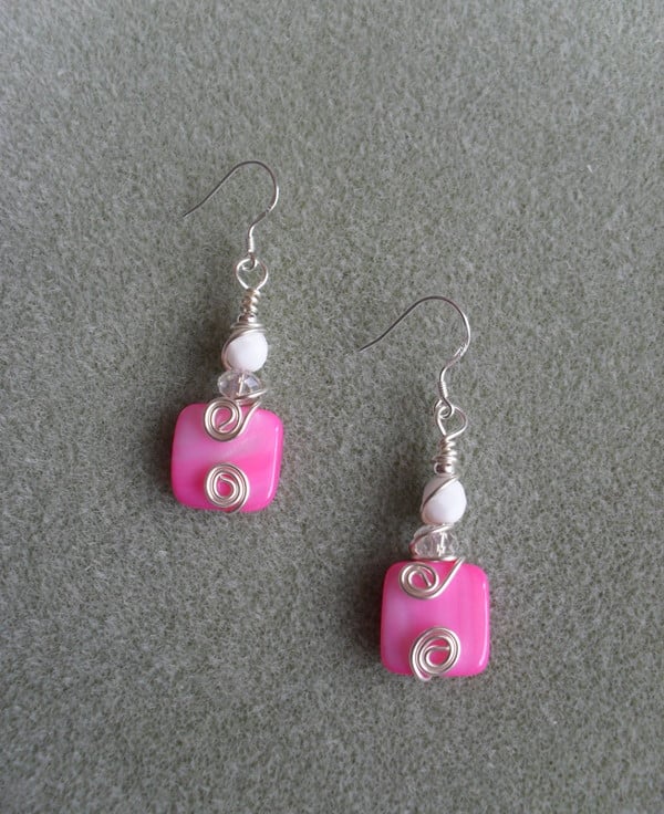 Pink Shell beads with white glass beads are attached to sterling silver ear wire's, with swirls of silver coloured wire to give decoration