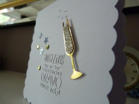 A completely handmade and uniquely designed card. Consisting of a tent fold quality scallop edged white card which has the words 'amazing, wow, bravo, nice job' embossed. A champagne glass with tiny silver rhinestones emulating fizzy bubbles. Finished off with silver star and gold sequins.