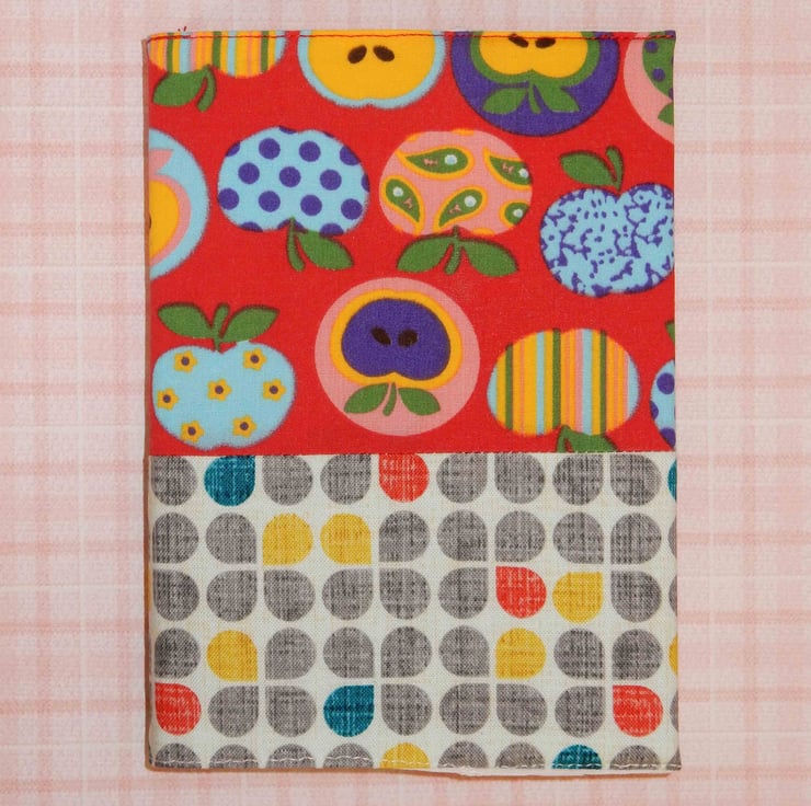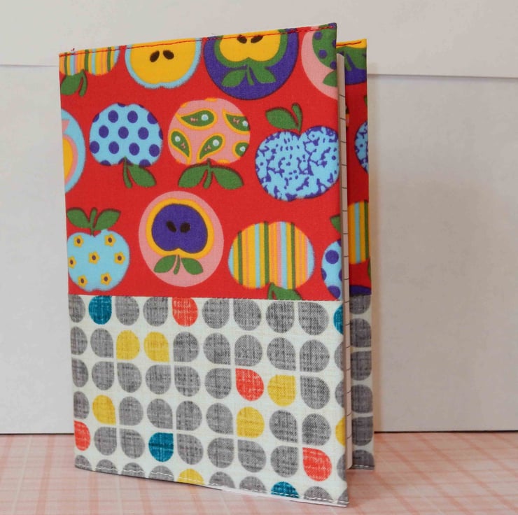 This is an A6 notebook, with lined paper,it has been covered with two fabrics, one featuring colourful apples, and the other a toning print. It is interfaced and lined in plain fabric, the cover can be removed, and a replacement notebook fitted when needed.