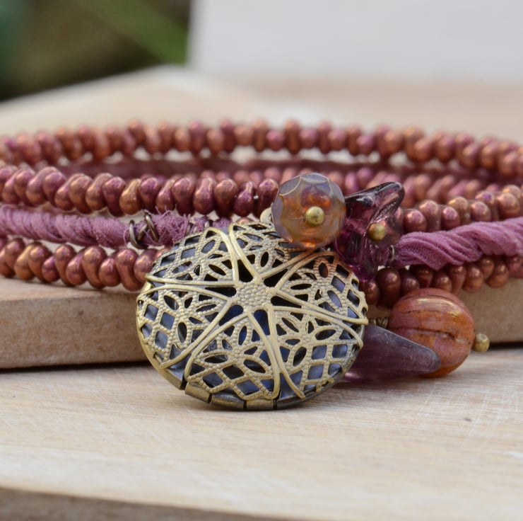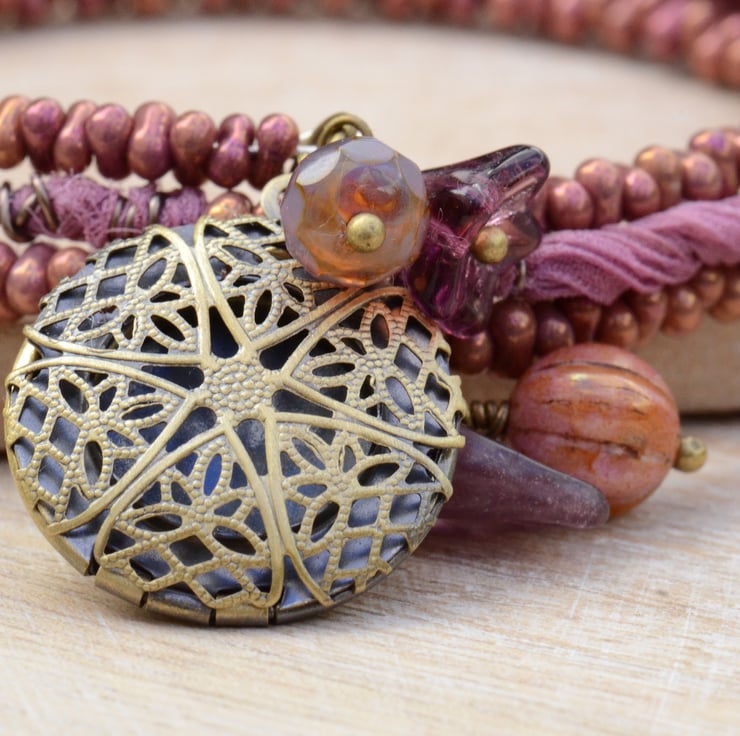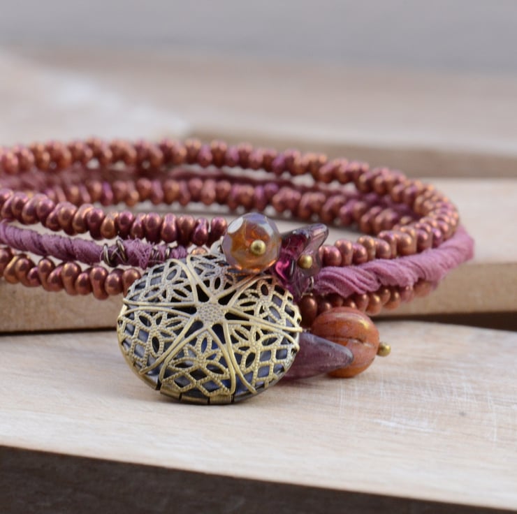 Amethyst purple bronze peanut shaped farfalle seed bead memory wire wrap bracelet with one "wrap" of amethyst purple chiffon ribbon finished with an antique bronze plated filigree locket, Czech melon Picasso finish beads, flower beads and leaf.