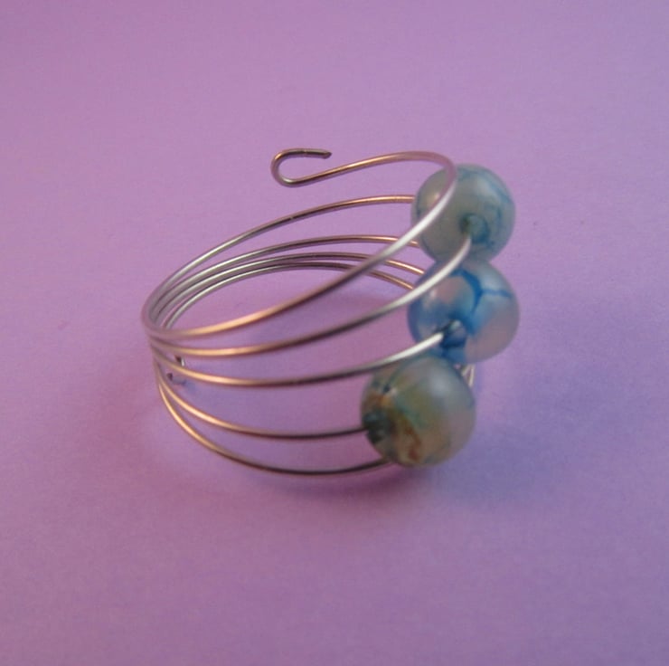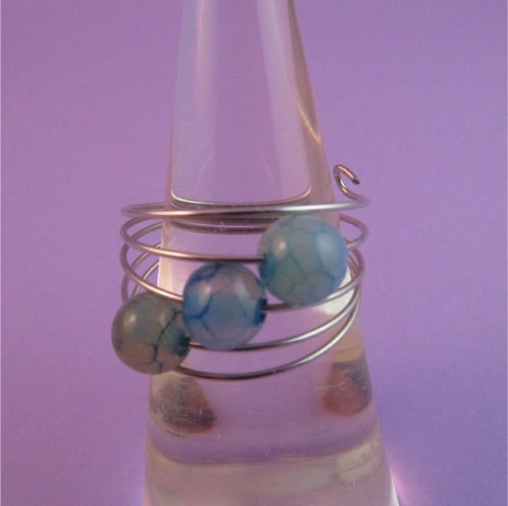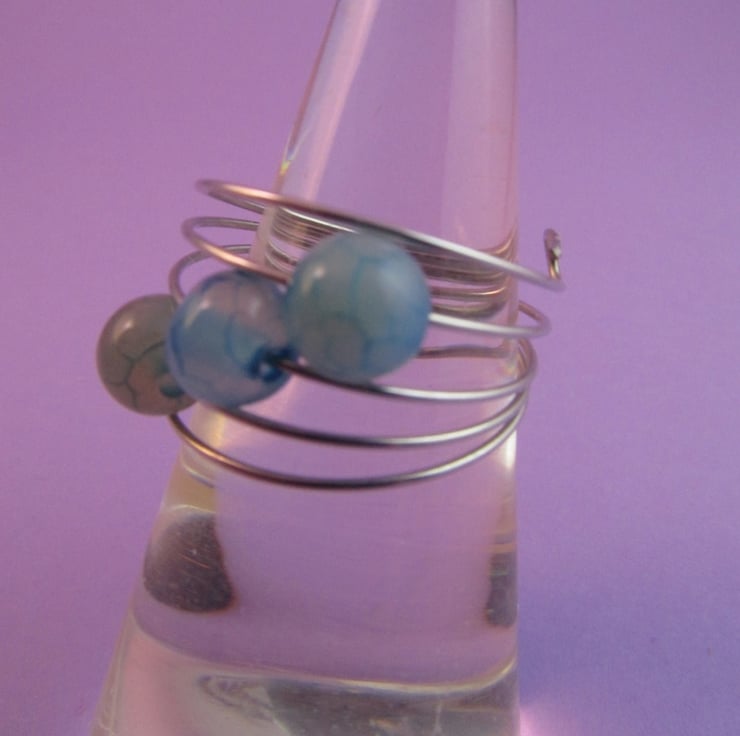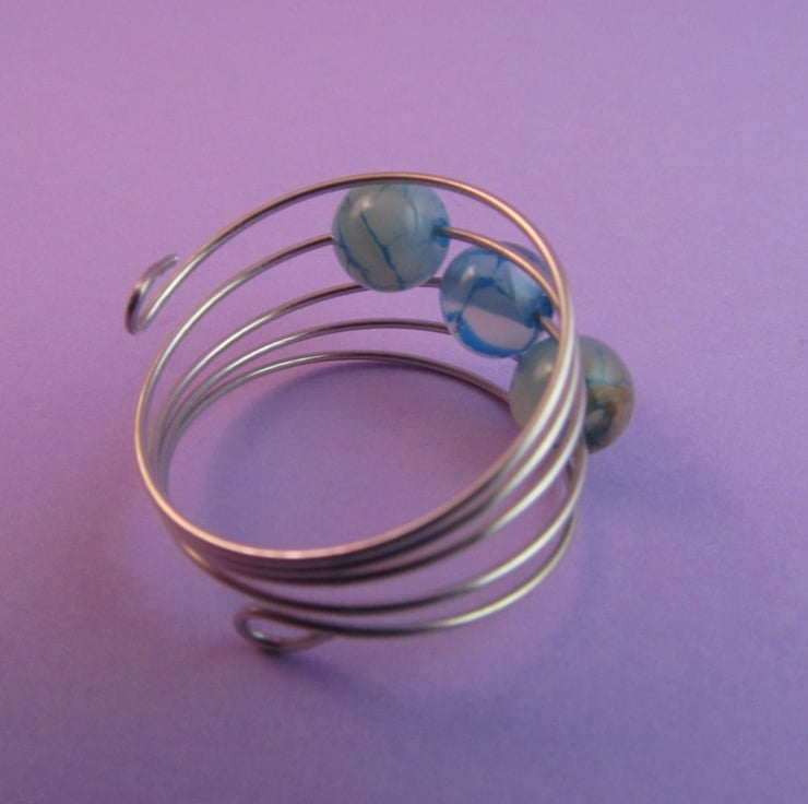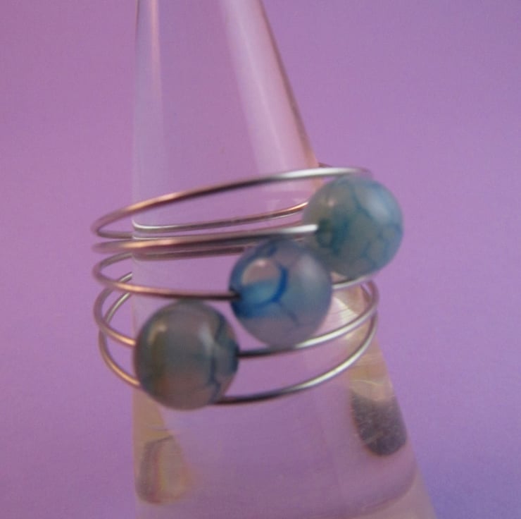This is a pretty blue dragon vein agate silver memory wire ring. It is created with silver colour memory wire, and real blue dragon vein agate gemstones. The ring is very comfortable to wear. The agates have an unusual and pretty pattern.