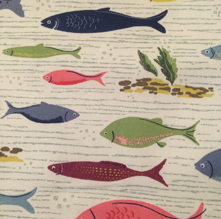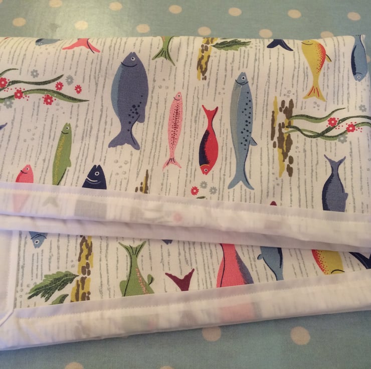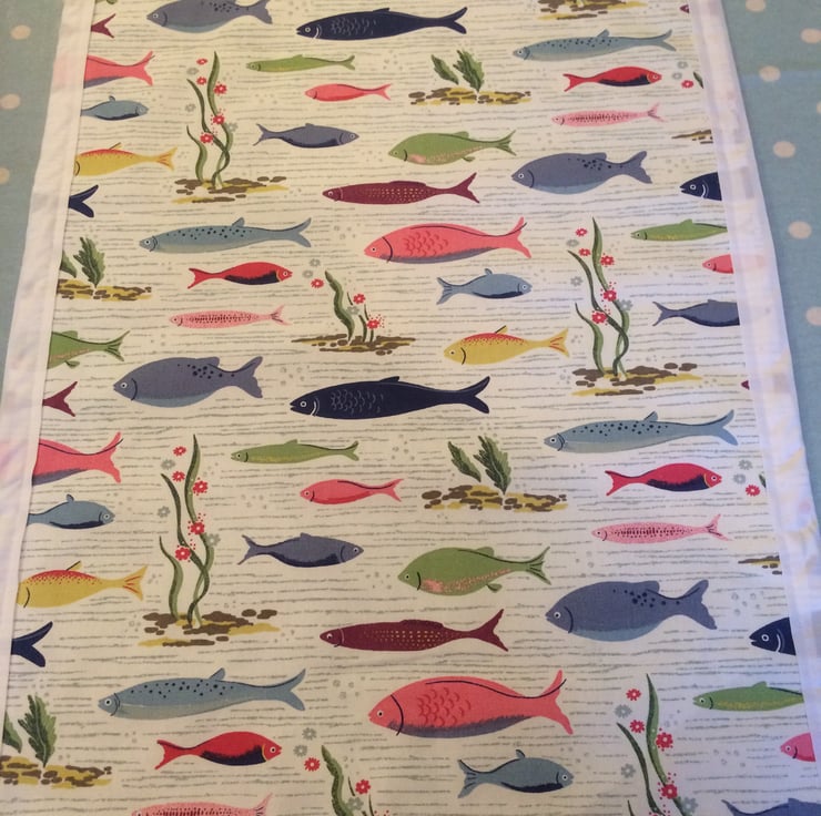 sweet quilt , blanket roughly measuring 30" x 20" , the front is cath kidston river fish fabric with a white cotton trim and white fleece back , this is a lightweight blanket with just the 2 layers , it can be machine washed on cool and line dried
