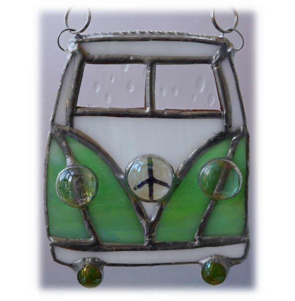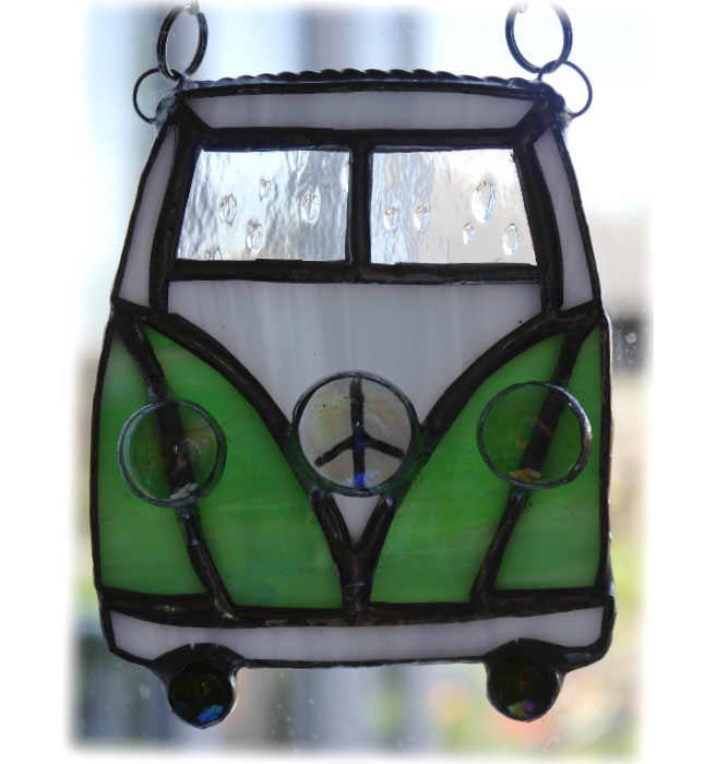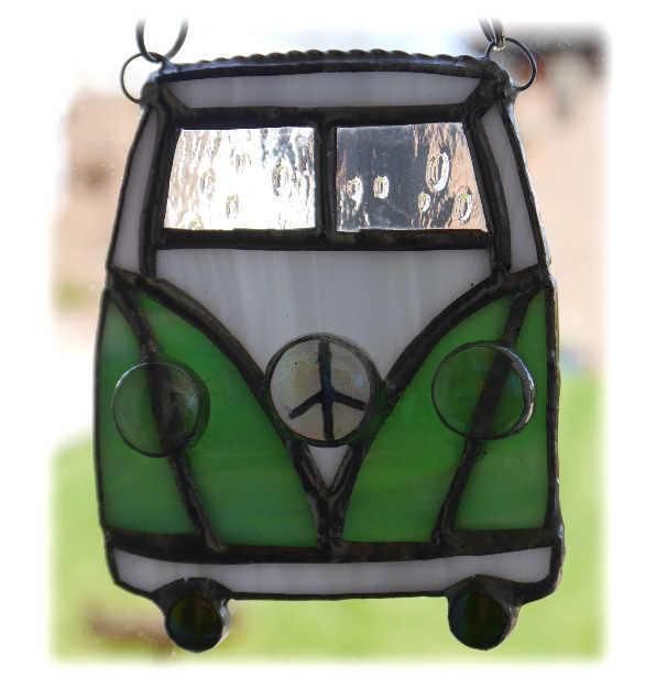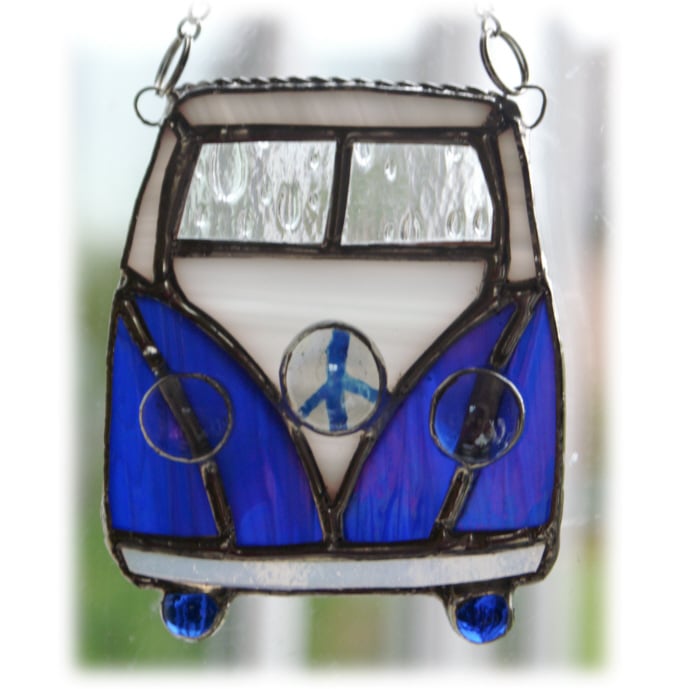 This suncatcher is hung from a chain which is securely attached by a solder wire ring to the top of the campervan. Please though do not try driving with it hanging in the window as it is glass and therefore a little delicate.