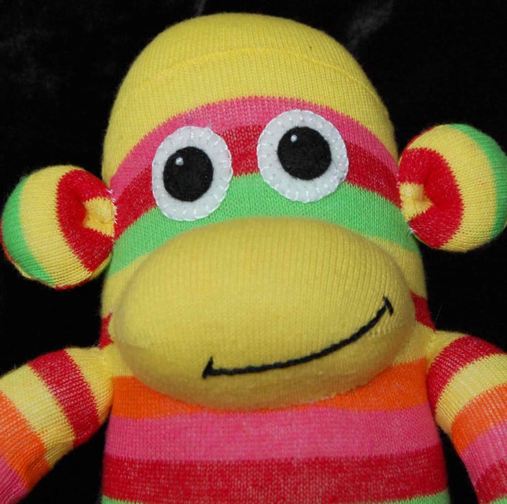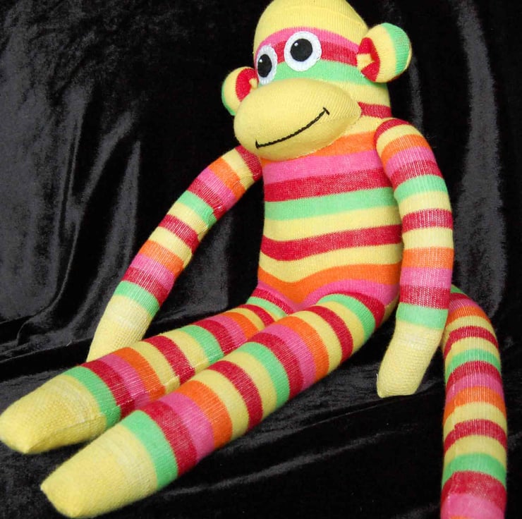 Jude is a fun soft monkey toy made from brand new stripey socks and filled with polyester fibrefill conforming to EN71, CE marked and safe for babies, children and adults too!