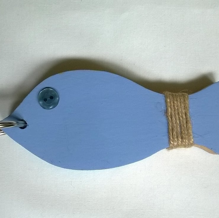 Hand painted wooden fish keyring, with a recessed button eye and jute twine wrapped around its tail.