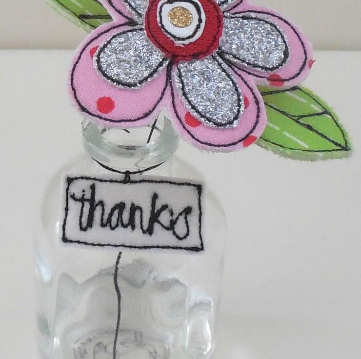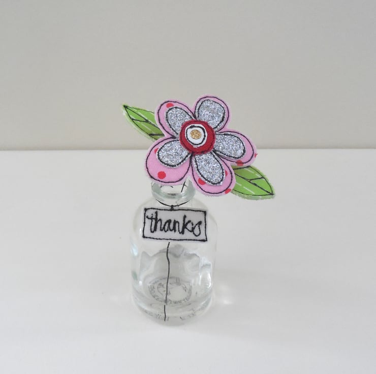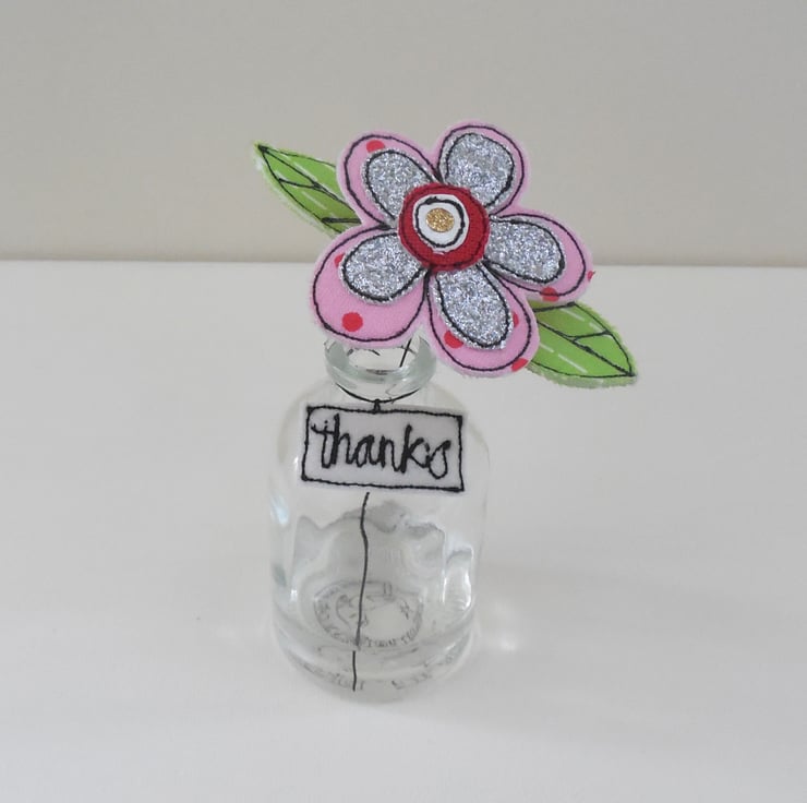 A fabric flower sits in a miniature glass bottle. The flower and leaves are created using sewn fabric and a wire stem holds them in position in acrylic water. The flower and bottle measure about 11cm and the flower about 4cm. Around each bottle neck hangs a sewn fabric label saying 'thanks'. Please note: for decorative purposes only.