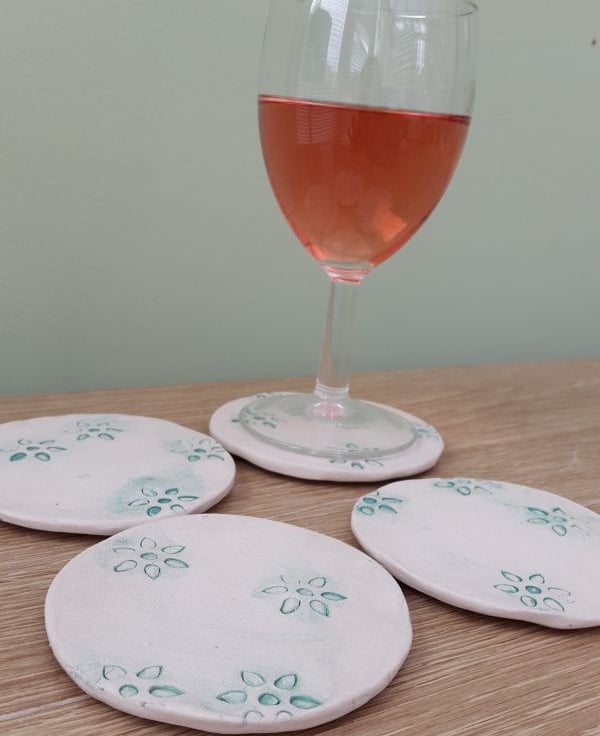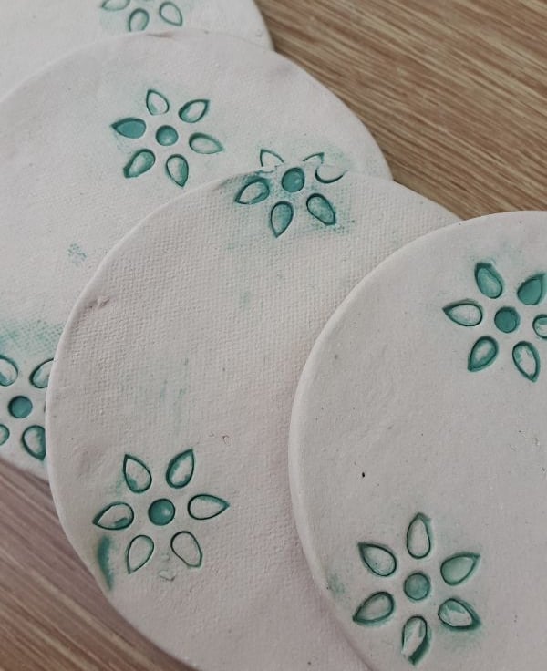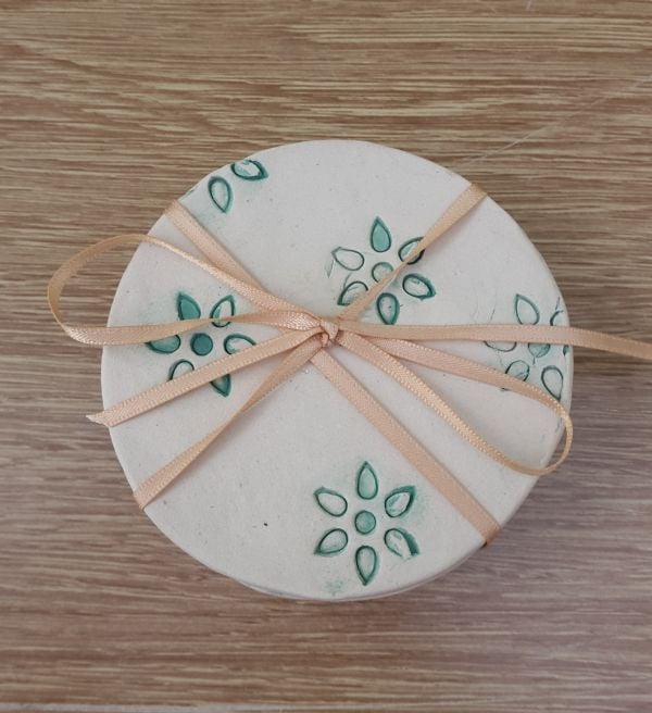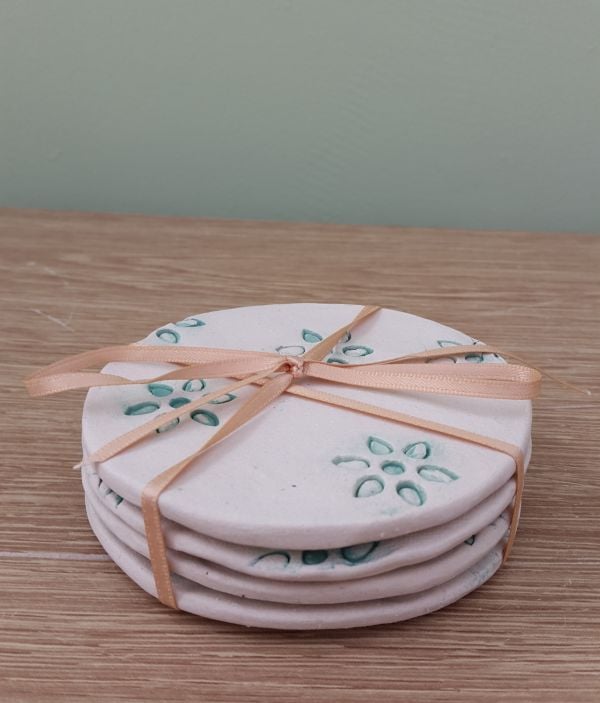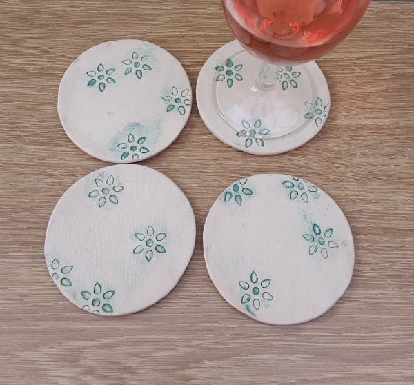 This set of 4 round handmade ceramic coasters are each individually decorated with an impressed flower design, glazed in mint green.