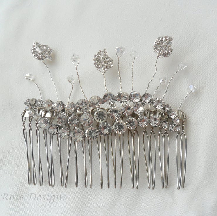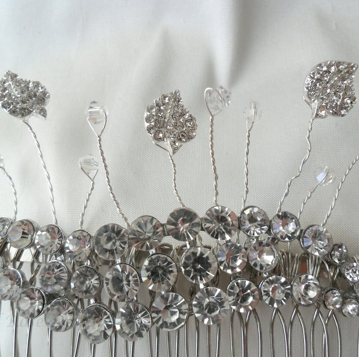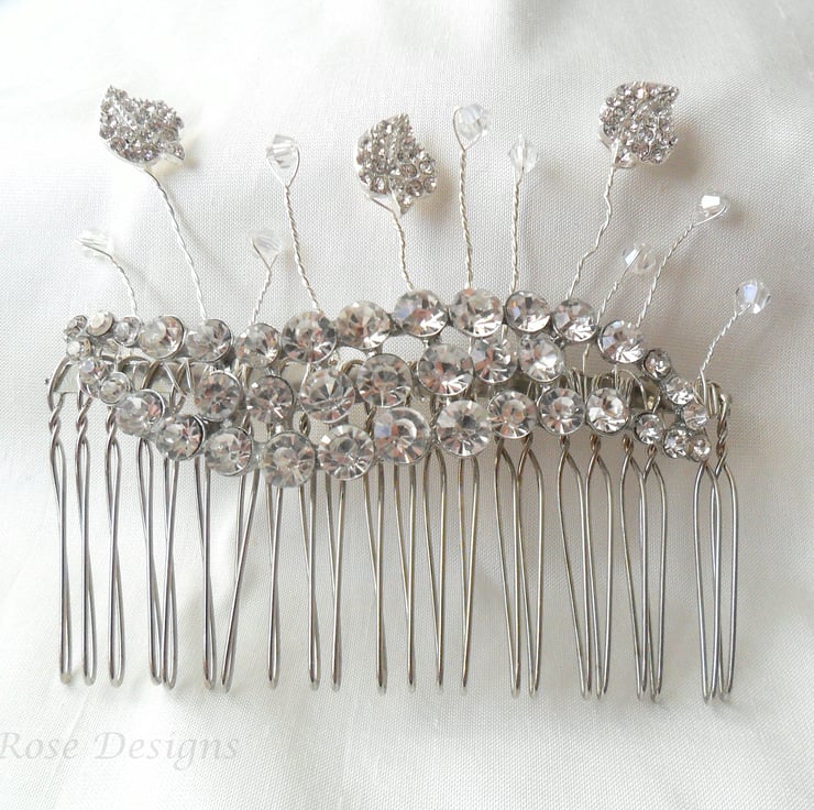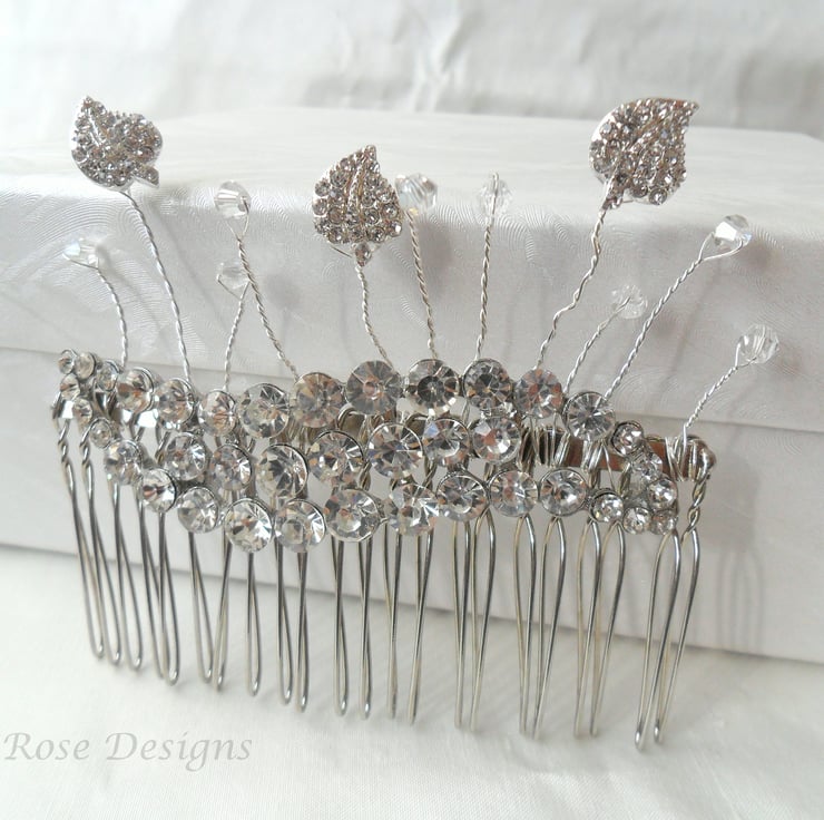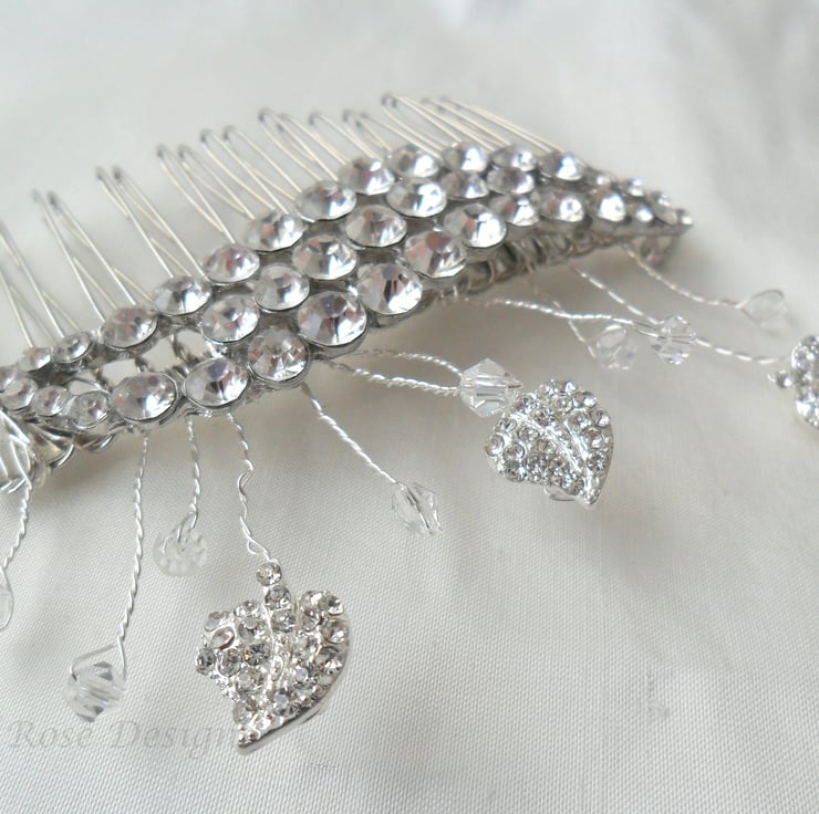 A diamante wave connector wired to a 3" silver-plated comb provides the focal point for this stunning hair accessory. Diamante leaves and clear crystal AB (aurora borealis) bi-cones are also wired to the comb in a random design. A beautiful way to set off your hair on your wedding day.